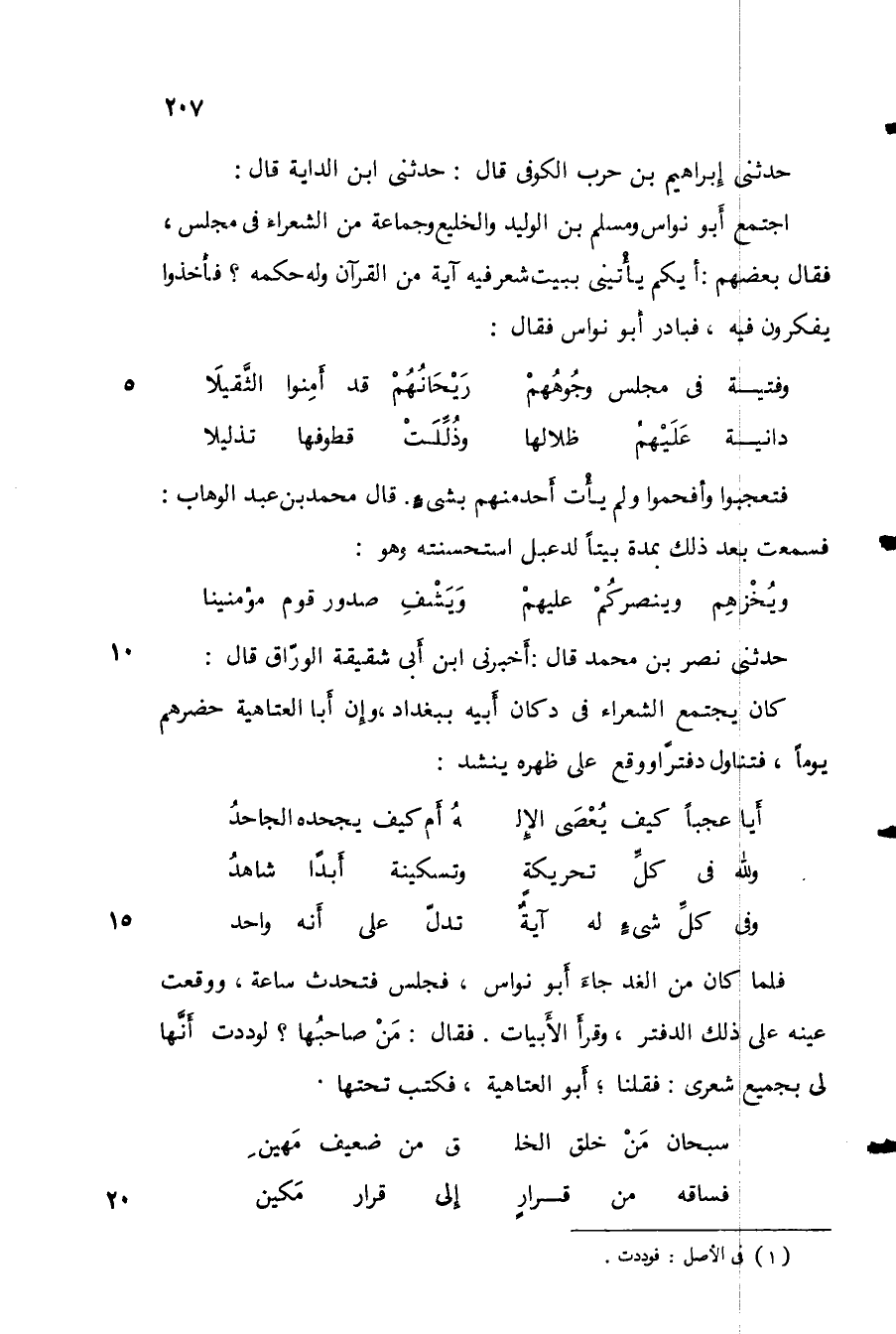 حدثني إبراهيم بن حرب الكوفي قال: حدثني ابن الداية قال: اجتمع أبو نواس ومسلم بن الوليد والخليع وجماعة من العراء في مجلس، فقال بعضهم: أيكم يأتيني ببيت شعر فيه آية من القرآن وله حكمه؟ فأخذوا يفكرون فيه، فبادر أبو نواس فقال: