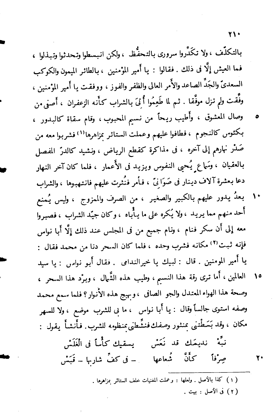 بالتكلف، ولا تكدروا سروري بالتحفظ، ولكن انبسطوا وتحدثوا وتبذلوا، فما العيش إلا في ذلك. فقالوا: يا أمير المؤمنين، بالطائر الميمون والكوكب السعدي والجد الصاعد والأمر العالي والظفر والفوز، ووفقت يا أمير المؤمنين، وفقت ولم تزل موفقاً. ثم لما طعموا أتي بالشراب كأنه الزعفران، أصغي من وصال المعشوق، وأطيب ريحاً من نسيم المحبوب، وقام سقاة كالبدور، بكئوس كالنجوم، فطافوا عليهم وعملت الستائر بمزاهرها فشربوا معه من صدر نهارهم إلى آخره، في مذاكرة كقطع الرياض، ونشيد كالدر المفصل بالعقبان، وسماع يحيي النفوس ويزيد الأعمار، فلما كان آخر النهار دعا بعشرة آلاف دينار في صواني، فأمر فنثرت عليهم فانتهبوها، والشراب بعد يدور عليهم بالكبير والصغير، من الصرف والممزوج، وليس يمنع أحد منهم مما يريد، ولا يكره على ما يأباه، وكان جيد الشراب، فصبروا معه إلى أن سكر فنام، ونام جميع من في المجلس عند ذلك إلا أبا نواس فإنه ثبت مكانه فشرب وحده، فلما كان السحر دنا من محمد فقال: يا أمير المؤمنين. قال: لبيك يا خير الندامى. فقال أبو نواس: يا سيد العالمين، أما ترى رقة هذا النسيم، وطيب هذه الشمال، وبرد هذا السحر، وصحة هذا الهواء المعتدل والجو الصافي، وبهيج هذه الأنوار؟ فلما سمع محمد وصفه استوى جالساً وقال: يا أبا نواس، ما بي للشرب موضع، ولا للسهر مكان، وقد بسطتني بمنثور وصفك فنشطني بمنظومه للشرب. فأنشأ يقول: