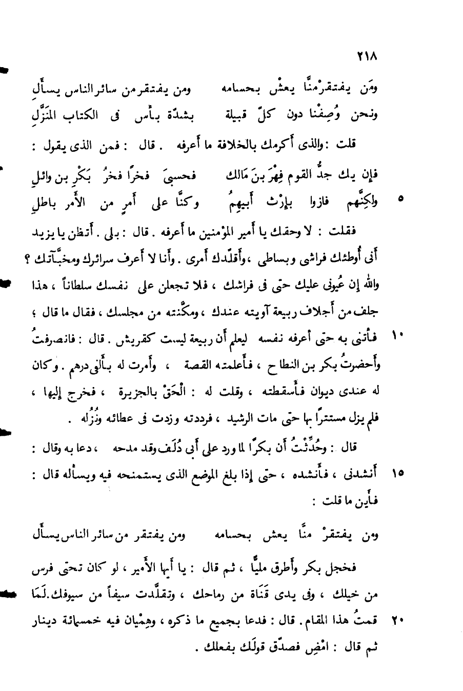 فقلت: لا وحقك يا أمير المؤمنين ما أعرفه. قال: بلى. أتظن يا يزيد أني أوطئك فراشي وبساطي، وأقلدك أمري. وأنا لا أعرف سرائرك ومخباتك؟ والله إن عيوني عليك حتى في فراشك، فلا تجعلن على نفسك سلطانا، هذا جلف من أجلاف ربيعة آويته عندك، ومكنته من مجلسك، فقال ما قال: فأتني به حتى أعرفه نفسه ليعلم أن ربيعة ليست كقريش. قال: فانصرفت وأحضرت بكر بن النطاح، فأعلمته القصة، وأمرت له بألفي درهم. وكان له عندي ديوان فأسقطته، وقلت له: الحق بالجزيرة، فخرج إليها، فلم يزل مستتراً بها حتى مات الرشيد، فرددته وزدت في عطائه ونزله.