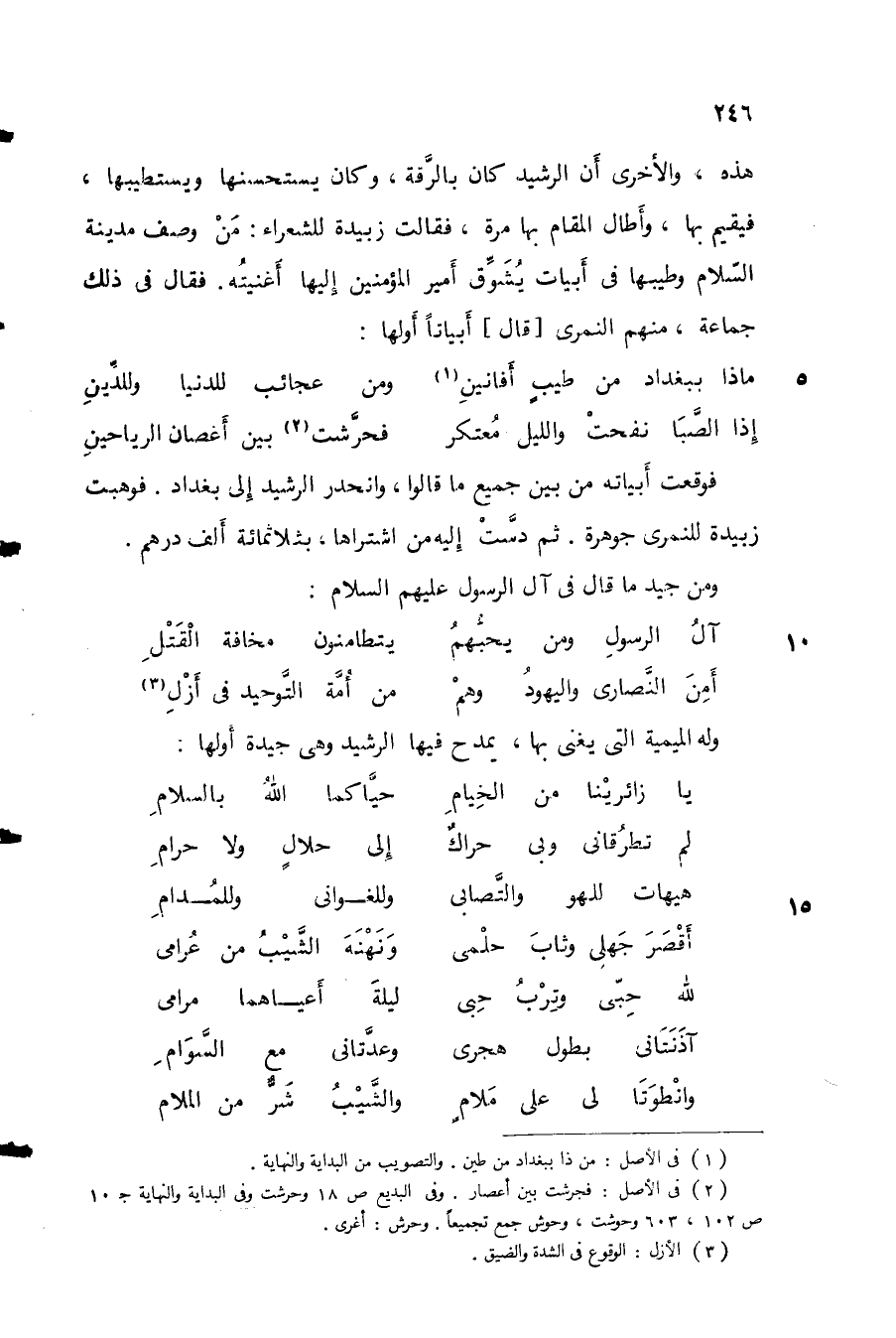 هذه، والأخرى أن الرشيد كان بالرقة، وكان يستحسنها ويستطيبها، فيقيم بها، وأطال المقام بها مرة، فقالت زبيدة للشعراء: من وصف مدينة السلام وطيبها في أبيات يشوق أمير المؤمنين إليها أغنيته. فقال في ذلك جماعة، منهم النمري قال أبياتاً أولها: