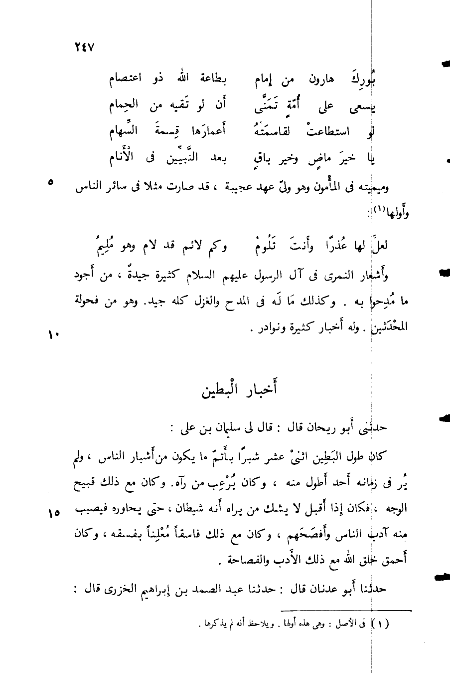 حدثني أبو ريحان قال: قال لي سليمان بن علي: كان طول البطين اثني عشر شبراً بأتم ما يكون من أشبار الناس، ولم ير في زمانه أحد أطول منه، وكان يرعب من رآه. وكان مع ذلك قبيح الوجه، فكان إذا أقبل لا يشك من يراه أنه شيطان، حتى يحاوره فيصيب منه آدب الناس وأفصحهم، وكان مع ذلك فاسقاً معلناً بفسقه، وكان أحمق خلق الله مع ذلك الأدب والفصاحة.