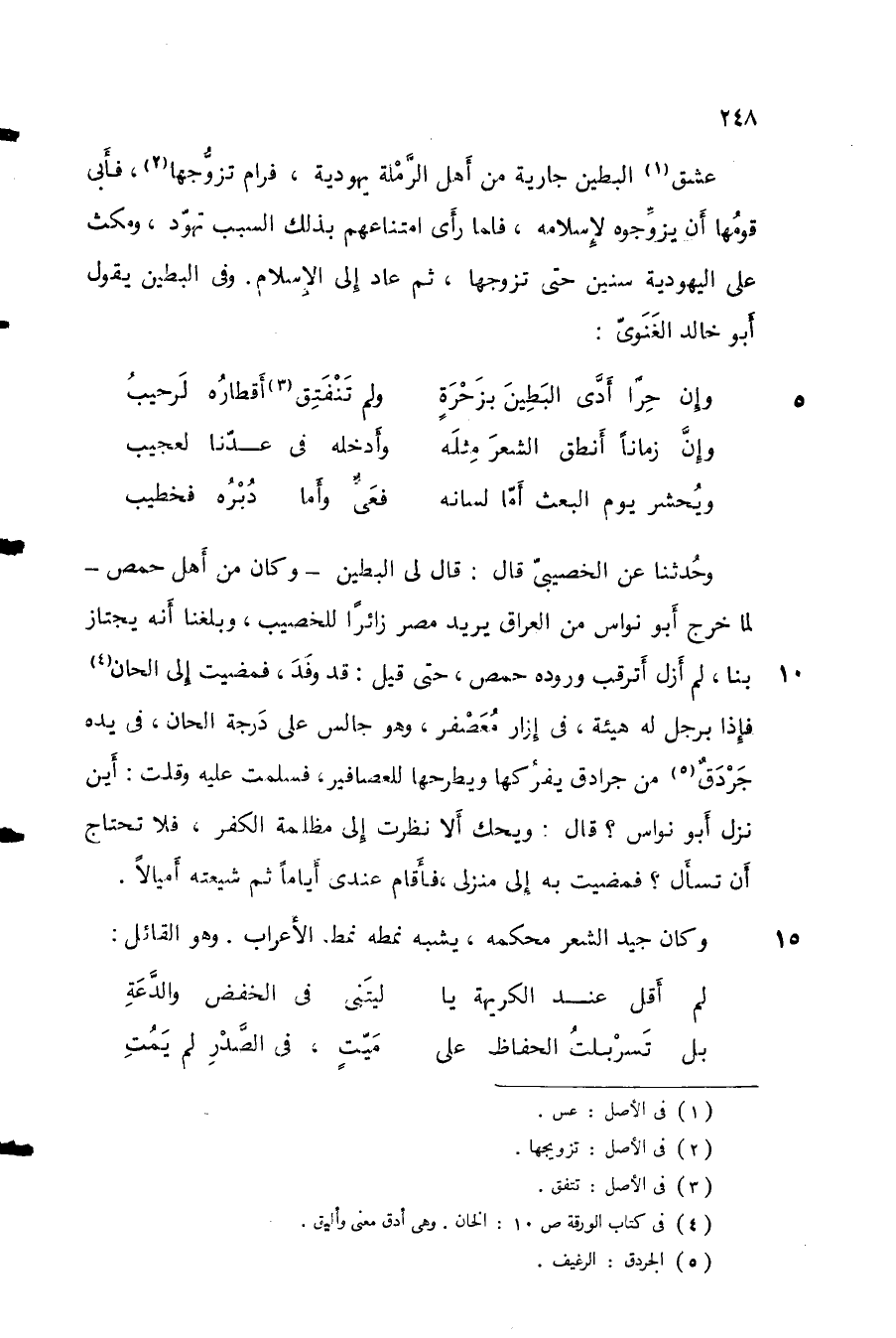 وحدثنا عن الخصيبي قال: قال البطين - وكان من أهل حمص - لما خرج أبو نواس من العراق يريد مصر زائراً للخصيب، وبلغنا أنه يجتاز بنا، لم أزل أترقب وروده حمص، حتى قيل: قد وفد، فمضيت إلى الحان فإذا برجل له هيئة، في إزار مُعصفر، وهو جالس على درجة الحان، في يده جردق من جرادق يفركها ويطرحها للعصافير، فسلمت عليه وقلت: أين نزل أبو نواس؟ قال: ويحك ألا نظرت إلى مظلمة الكفر، فلا تحتاج إن تسأل؟ فمضيت به إلى منزلي، فأقام عندي أياماً ثم شيعته أميالاً.