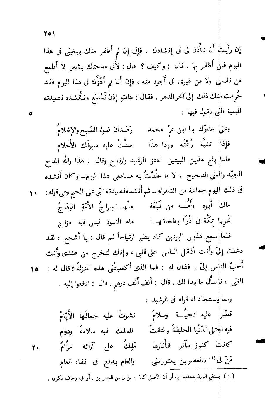 فلما بلغ هذين البيتين اهتز الرشيد وارتاح وقال: هذا والله المدح الجيد والمعنى الصحيح، لا ما عللت به مسامعي هذا اليوم - وكان أنشده في ذلك اليوم جماعة من الشعراء - ثم أنشده قصيدته التي على الجيم وهي قوله: