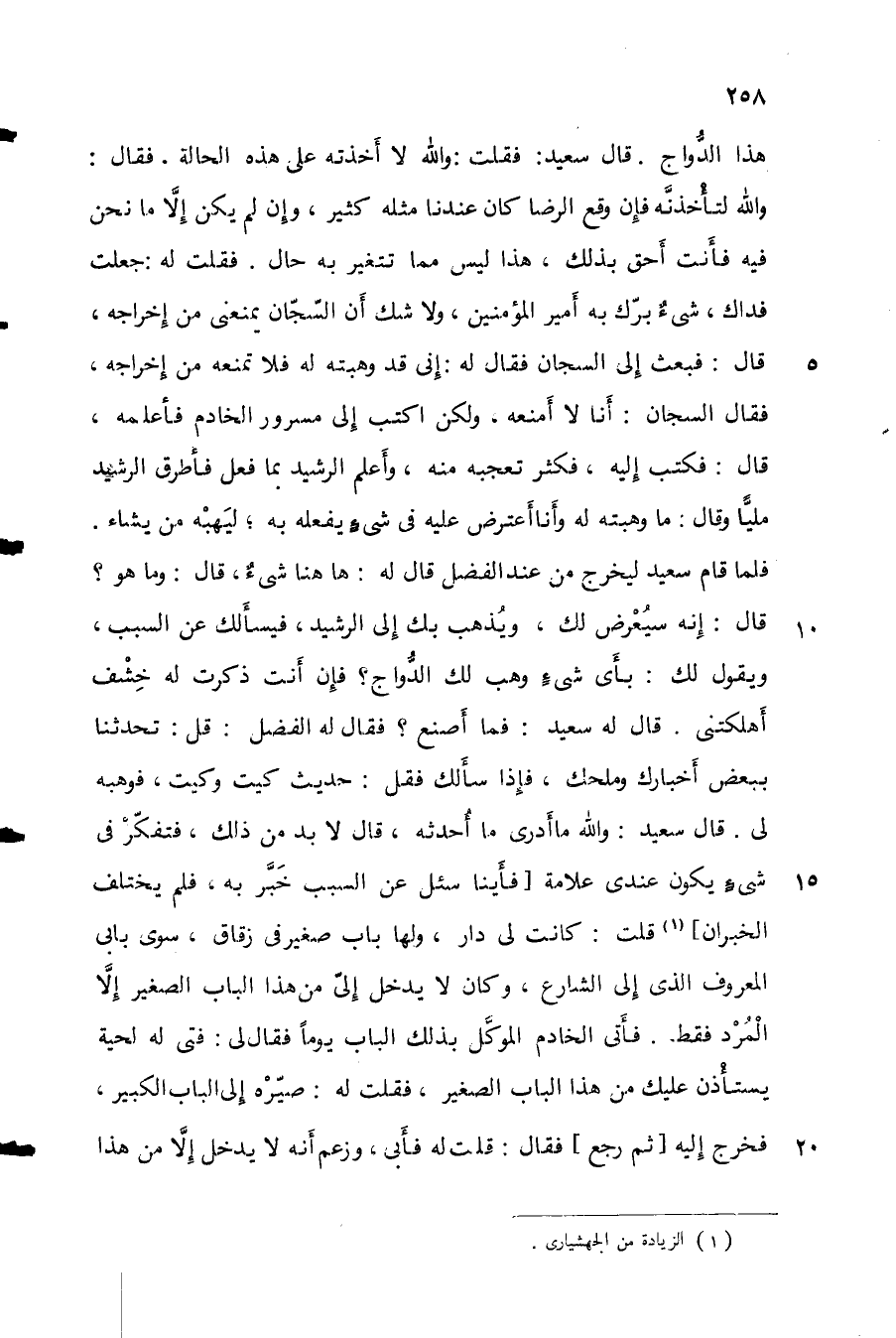 هذا الدواج. قال سعيد: فقلت: والله لا أخذته على هذه الحالة. فقال: والله لتأخذنه فإن وقع الرضا كان عندنا مثله كثير، وإن لم يكن إلا ما نحن فيه فأنت أحق بذلك، هذا ليس مما تتغير به حال. فقلت له: جعلت فداك، شيء برك به أمير المؤمنين، ولا شك أن السجان يمنعني من إخراجه، قال: فبعث إلى السجان فقال له: إني قد وهبته له فلا تمنعه من إخراجه، فقال السجان أنا لا أمنعه. ولكن اكتب إلى مسرور الخادم فأعلمه، قال: فكتب إليه، فكثر عجبه منه، وأعلم الرشيد بما فعل فأطرق الرشيد ملياً وقال: ما وهبته له وأنا أعترض عليه في شيءٍ يفعله به؛ ليهبه من يشاء. فلما قام سعيد ليخرج من عند الفضل قال له: ها هنا شيء قال: وما هو؟ قال: إنه سيعرض لك، ويذهب لك إلى الرشيد، فيسألك عن السبب، ويقول لك: بأي شيء وهب لك الدواج؟ فإن أنت ذكرت له خشف أهلكتني. قال له سعيد: فما أصنع؟ فقال له الفضل: قل: تحدثنا ببعض أخبارك وملحك، فإذا سألك فقل: حديث كيت وكيت، فوهبه لي. قال سعيد: والله ما أدري ما أحدثه، قال لا بد من ذلك، فتفكر في شيء يكون عندي علامة فأينا سئل عن السبب خبر به، فلم يختلف الخبران قلت: كانت لي دار، ولها باب صغير في زقاق، سوى بابي المعروف الذي إلى الشارع، وكان لا يدخل إليّ من هذا الباب الصغير إلا المرد فقط. فأتى الخادم الموكل بذلك الباب يوماً فقال لي: فتى له لحية يستأذن عليك من هذا الباب الصغير فقلت له: صيره إلى الباب الكبير، فخرج إليه ثم رجع فقال: قلت له فأبى. وزعم أنه لا يدخل إلا من هذا
