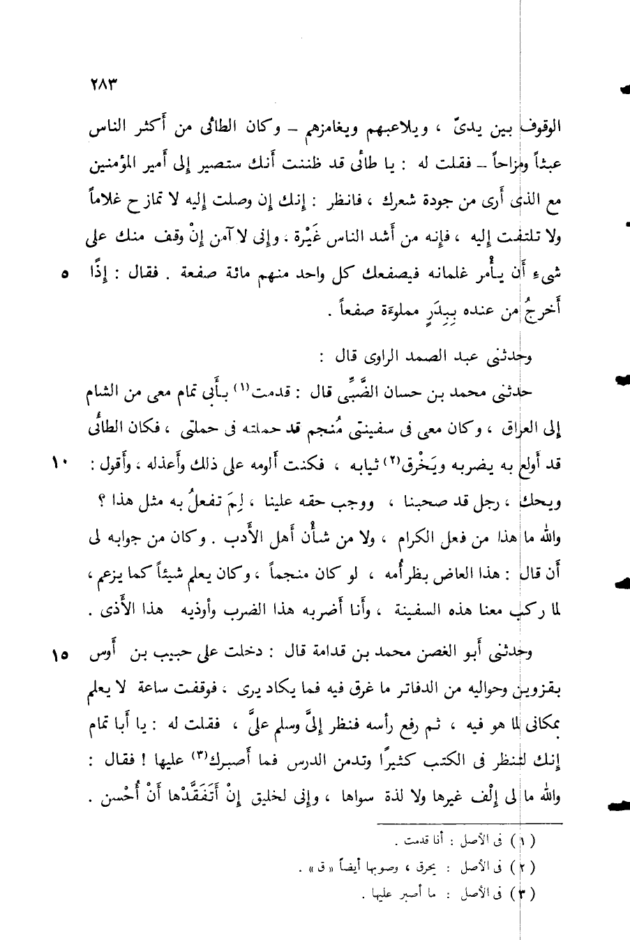 وحدثني عبد الصمد الراوي قال: حدثني محمد بن حسان الضبي قال: قدمت بأبي تمام معي من الشام إلى العراق، وكان معي في سفينتي منجم قد حملته في حملتي، فكان الطائي قد أولع به يضربه ويخرق ثيابه، فكنت ألومه على ذلك وأعذله، وأقول: ويحك، رجل قد صحبنا، ووجب حقه علينا، لم تفعل به مثل هذا؟ والله ما هذا فعل الكرام، ولا من شأن أهل الأدب. وكان من جوابه لي أن قال: هذا من عض بظر أمه، لو كان منجماً، وكان يعلم شيئاً كما يزعم، لما ركب معنا هذه السفينة، وأنا أضربه هذا الضرب وأوذيه هذا الأذى.