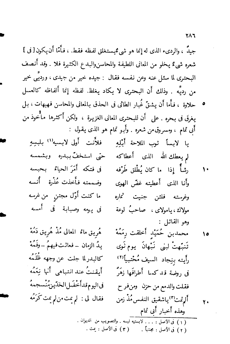 جيد، والرديء الذي له إنما هو شيء يستغلق لفظه فقط. فأما أن يكون في شعره شيء يخلو من المعاني اللطيفة والمحاسن والبدع الكثيرة فلا، وقد أنصف البحتري لما سئل عنه وعن نفسه فقال: جيد خير من جيدي، ورديي خير من رديه، وذلك أن البحتري لا يكاد يغلظ لفظ هـ، إنما ألفاظه كالعسل حلاوة، فأما أن يشق غبار الطائي في الحذق بالمعاني والمحاسن فهيهات، بل يغرق في بحره. على أن للبحتري المعاني الغزيرة، ولكن أكثرها مأخوذ من أبي تمام، ومسروق من شعره. وأبو تمام هو الذي يقول: