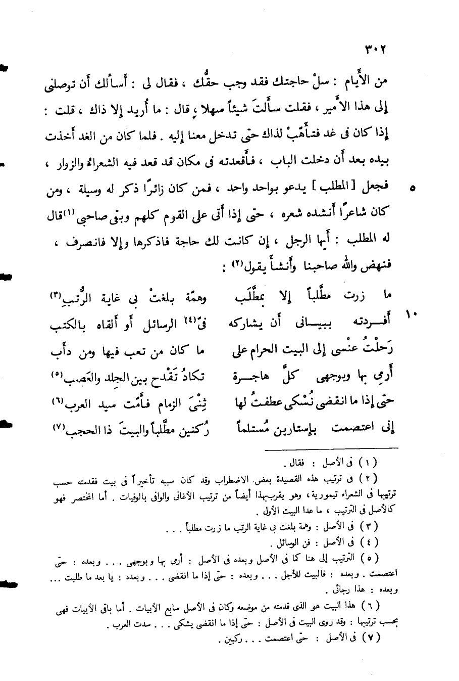 من الأيام: سل حاجتك فقد وجب حقك، فقال لي: أسألك أن توصلني إلى هذا الأمير، فقلت سألت شيئاً سهلا، قال: ما أريد إلا ذاك، قلت: إذا كان في غد فتأهب لذاك حتى تدخل معنا إليه. فلما كان من الغد أخذت بيده بعد أن دخلت الباب، فأقعدته في مكان قد قعد فيه الشعراء الزوار، فجعل المطلب يدعو بواحد واحد، فمن كان زائر ذكر له وسيلة، ومن كان شاعراً أنشده شعره، حتى إذا أتى على القوم كلهم وبقي صاحبي قال له المطلب: أيها الرجل، إن كانت لك حاجة فاذكرها وإلا فانصرف، فنهض والله صاحبنا وأنشأ يقول: