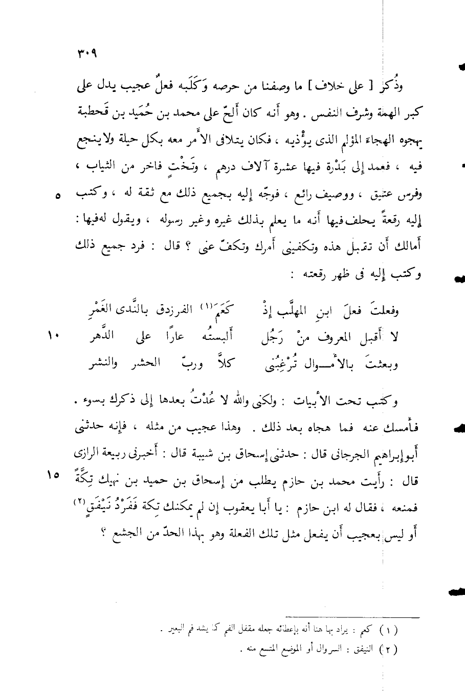 وكتب تحت الأبيات: ولكني والله لا عدت بعدها إلى ذكرك بسوء فأمسك عنه فما هجاه بعد ذلك. وهذا عجيب من مثله، فإنه حدثني أبو إبراهيم الجرجاني قال: حدثني إسحاق بن شيبة قال: أخبرني ربيعة الرازي قال: رأيت محمد بن حازم يطلب من إسحاق بن حميد بن نهيك تِكَّةً فمنعه، فقال له ابن حازم: يا أبا يعقوب إن لم يمكنك تكة ففرد نيفق أو ليس بعجيب أن يفعل مثل تلك الفعلة وهو بهذا الحد من الجشع؟