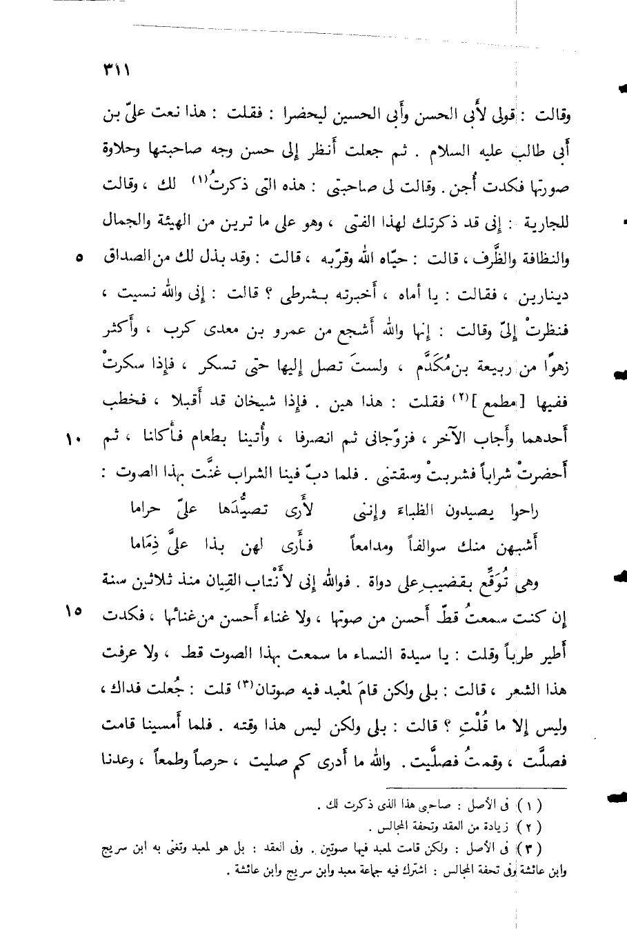 وهي توقع بقضيب على دواة. فوالله إني لأنتاب القيان منذ ثلاثين سنة إن كنت سمعت قط أحسن من صوتها، ولا غناء أحسن من غنائها، فكدت أطير طرباً وقلت: يا سيدة النساء ما سمعت بهذا الصوت قط، ولا عرفت هذا الشعر، قالت: بلى ولكن قام لمعبد فيه صوتان قلت: جعلت فداكن وليس إلا ما قلت؟ قالت: بلى ولكن ليس هذا وقته. فلما أمسينا قامت فصلت، وقمت فصليت. والله ما أدري كم صليت، حرصاً وطمعاً، وعدنا