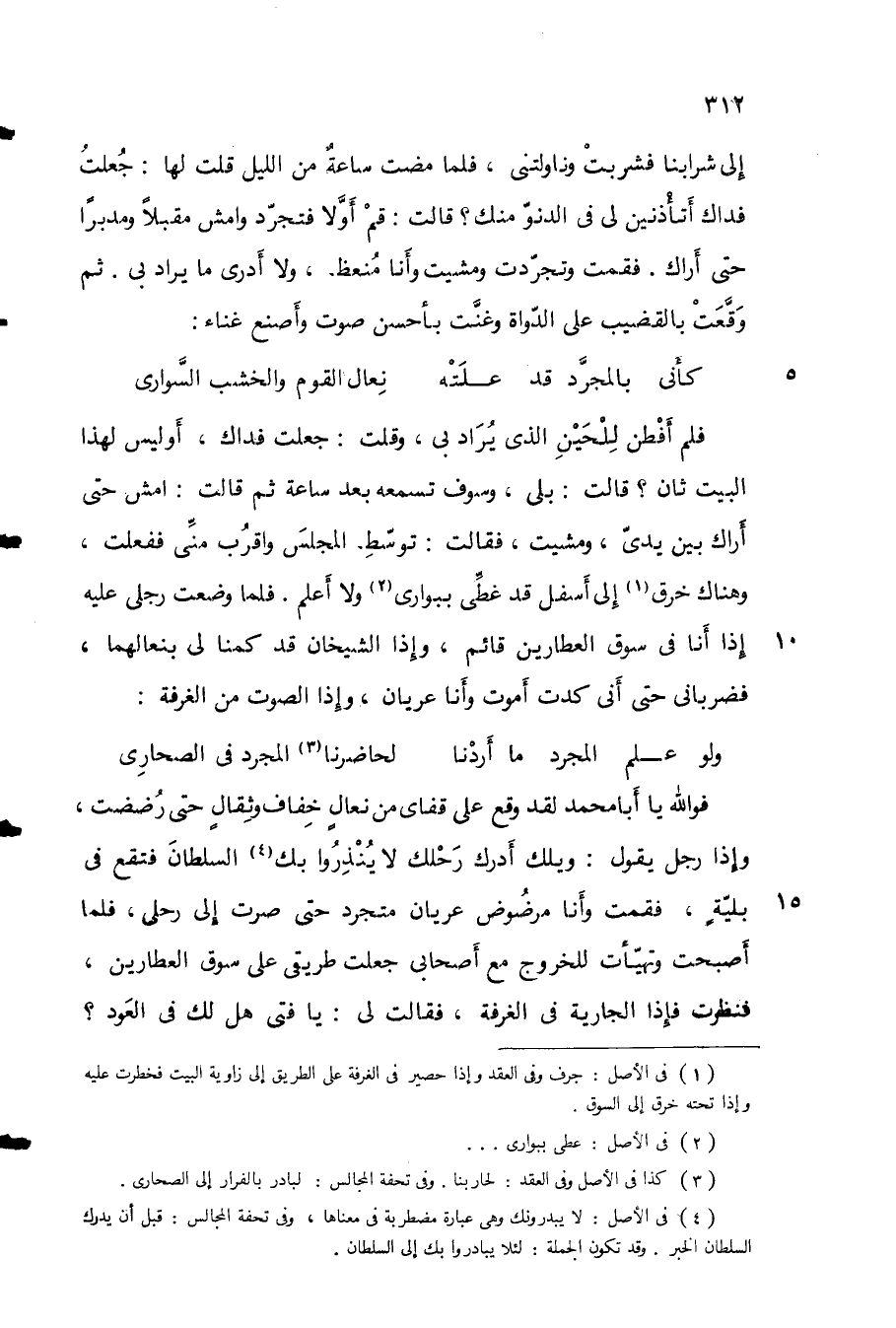 إلى شرابنا فشربت وناولتني، فلما مضت ساعة من الليل قلت لها: جعلت فداك أتأذنين لي في الدنو منك؟ قالت: قم أولا فتجرد وأمش مقبلاً ومدبراً حتى أراك. فقمت وتجردت ومشيت وأنا منعظ، ولا أدري ما يراد بي، ثم وقعت بالقضيب على الدواة وغنت بأحسن صوت وأصنع غناء