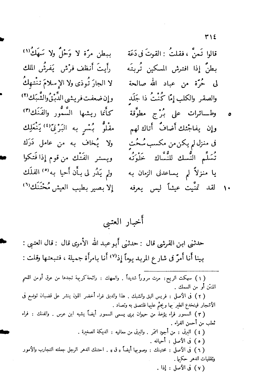 حدثني ابن القرشي قال: حدثني أبو عبد الله الأموي قال: قال العتبي: بينا أنا أمر في شارع المربد يوماً إذ أنا بامرأة جميلة، فتبعتها وقلت: