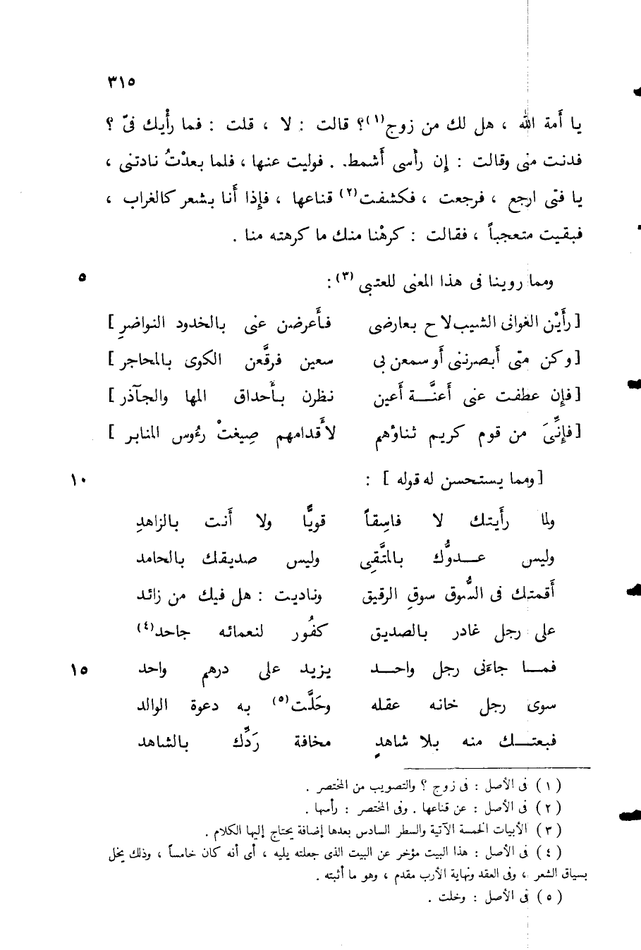 يا أمة اله، هل لك زوج؟ قالت: لا، قلت: فما رأيك في؟ فدنت مني وقالت: إن رأسي أشمط. فوليت عنها، فلما بعدت نادتني، يا فتى ارجع، فرجعت، فكشفت قناعها، فإذا أنا بشعر كالغراب، فبقيت متعجباً، فقالت: كرهنا منك ما كرهته منا.