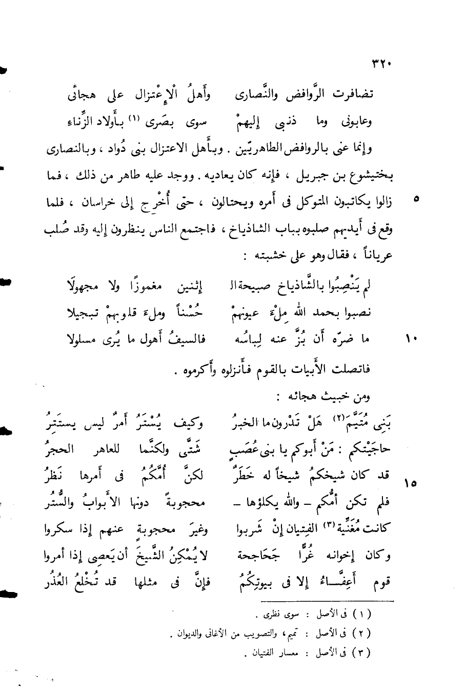 وإنما عني بالروافض الطاهريين. وبأهل الاعتزال بني داود، وبالنصارى بختيشوع بن جبريل، فإنه كان يعاديه. ووجد عليه طاهر من ذلك، فما زالوا يكاتبون المتوكل في أمره ويحتالون، حتى أخرج إلى خراسان، فلما وقع في أيديهم صلبوه بباب الشاذياخ، فاجتمع الناس ينظرون إليه وقد صلب عرياناً، فقال وهو على خشبته: