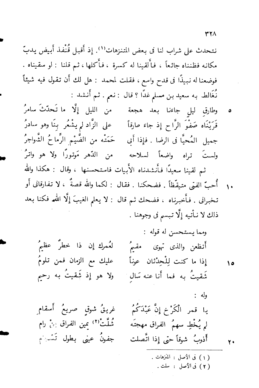 نتحدث على شراب لنا في بعض المتنزهات. غذ أقبل قنفذ أبيض يدب مكانه فظنناه جائعاً، فألقينا له كسرة، فأكلها، ثم قلنا: لو سقيناه. فوضعنا له نبيذاً في قدح واسع، فقلت لمحمد: هل لك أن تقول فيه شيئاً نُغالط به سعيد بن مسلم غداً؟ قال: نعم. ثم أنشد:
