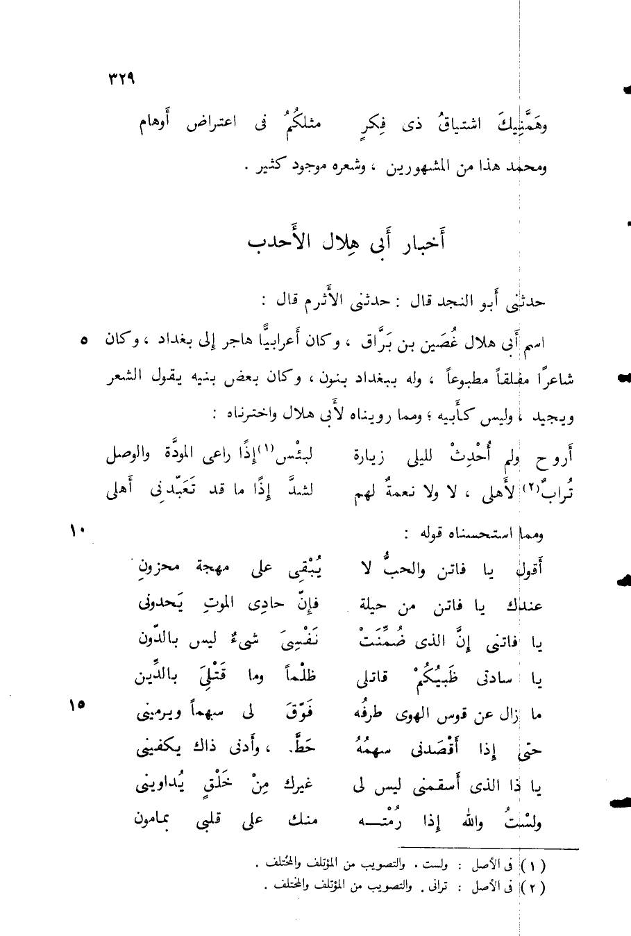 حدثني أبو النجد قال: حدثني الأثرم قال: اسم أبي هلال عصين بن براق، وكان أعرابياً هاجر إلى بغداد، وكان شاعراً مفلقاً مطبوعاً، وله ببغداد بنون، وكان بعض بنيه يقول الشعر ويجيد، وليس كأبيه، ومما رويناه لبي هلال واخترناه: