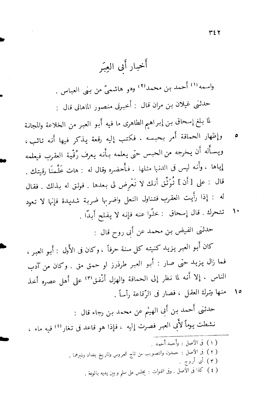 حدثني غيلان بن مران قال: أخبرني منصور الماهاني قال: لما بلغ إسحاق بن إبراهيم الطاهري ما فيه أبو العبر من الخلاعة والمجانة وإظهار الحماقة أمر بحبسه، فكتب إليه رقة يكر فيها أنه تائب، ويسأله أن يخرجه من الحبس حتى يعلمه بأنه يعرف رقية العقرب فيعلمه إياها. وأنه ليس في الدنيا مثلها. فأحضره وقال له: هات علِّمنا رقيتك. قال: على أن توثق أنك لا تعرض لي بعدها. فوثق له بذلك. فقال له: إذا رأيت العقرب فتناول النعل واضربها ضربة شديدة فإنها لا تعود تتحرك. قال إسحاق: خلوا عنه فإنه لا يفلح أبداً حدثني الفيض بن محمد عن أبي روح قال: كان أبو العبر يزيد كنيته كل سنة حرفاً، وكان في الأول: أبو العبر، فما زال يزيد حتى صار: أبو العبر طرذرز لو حمق مق. وكان من آدب الناس، إلا أنه لما نظر إلى الحماقة والهزل أنفق على أهل عصره أخذ منها وترك العقل، فصار في الرقاعة رأساً.