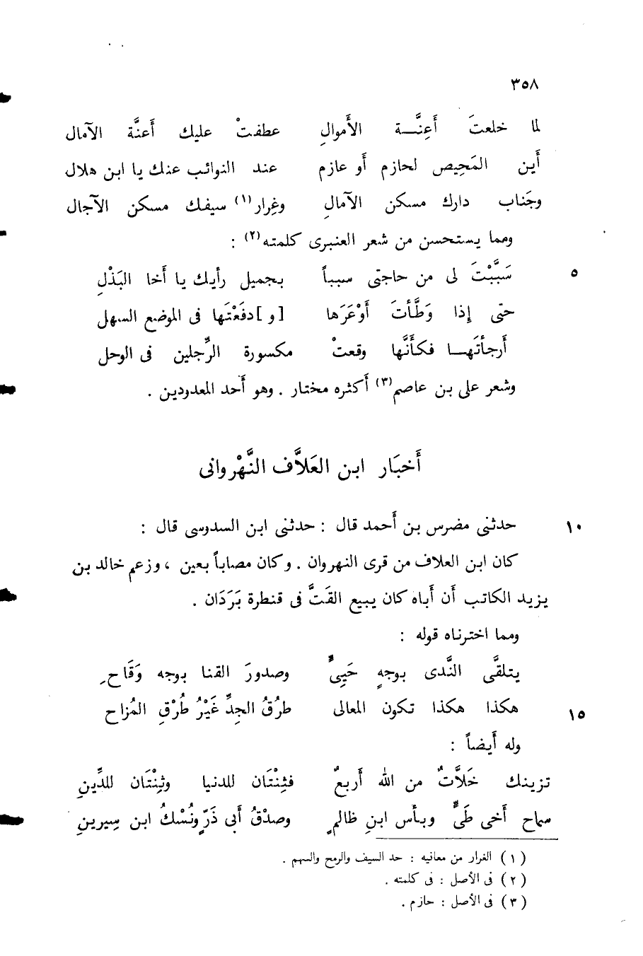 حدثني مضرس بن أحمد قال: حدثني ابن السدرسي قال: كان ابن العلاف من قرى النهروان. وكان مصاباً بعين، وزعم خالد بن يزيد الكاتب أن أباه كان يبيع القت في قنطرة بردان.