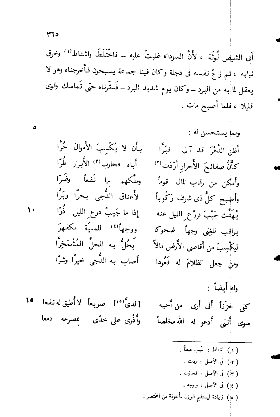 أبي الشيص لوثة، لأن السوداء غلبت عليه - فاختلط واشتاط وخرق ثيابه، ثم زج نفسه في دجلة وكان فينا جماعة يسبحون فأخرجناه وهو لا يعقل لما به من البرد - وكان يوم شديد البرد - فدثرناه حتى تماسك وقوي قليلاً، فلما أصبح مات.