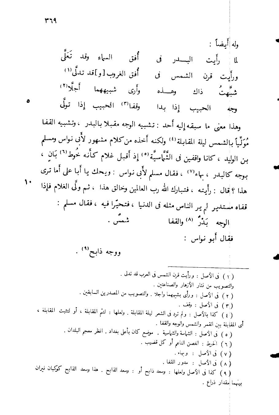 وهذا معنى ما سبقه إليه أحد: تشبيه الوجه مقبلا بالبدر، وتشبيه القفا مولياً بالشمس ليلة المقابلة ولكنه أخذه من كلام مشهور لأبي نواس ومسلم بن الوليد، كانا واقفين في الشماسية إذ أقبل غلام كأن خوط بانٍ، بوجه كالبدر، بهاء، فقال مسلم لأبي نواس: ويحك يا أبا علي أماترى هذا؟ قال: رأيته، فتبارك الله رب العاملين وخالق هذا، ثم ولي الغلام فإذا قفاه مستدير لم ير الناس مثله في الدنيا فتحيرا فيه فقال مسلم: