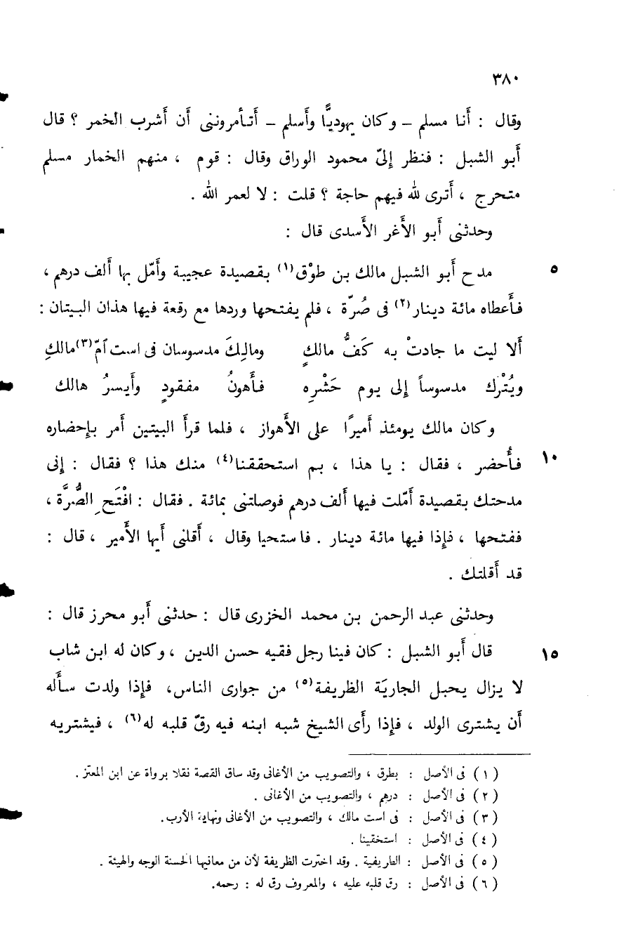 وقال: أنا مسلم - وكان يهودياً واسلم - أتأمرونني أن اشرب الخمر؟ قال أبو الشبل: فنظر إلي محمود الوراق وقال: قوم، منهم الخمار مسلم متحرج، أترى لله فيهم حاجة؟ قلت: لا لعمر الله.