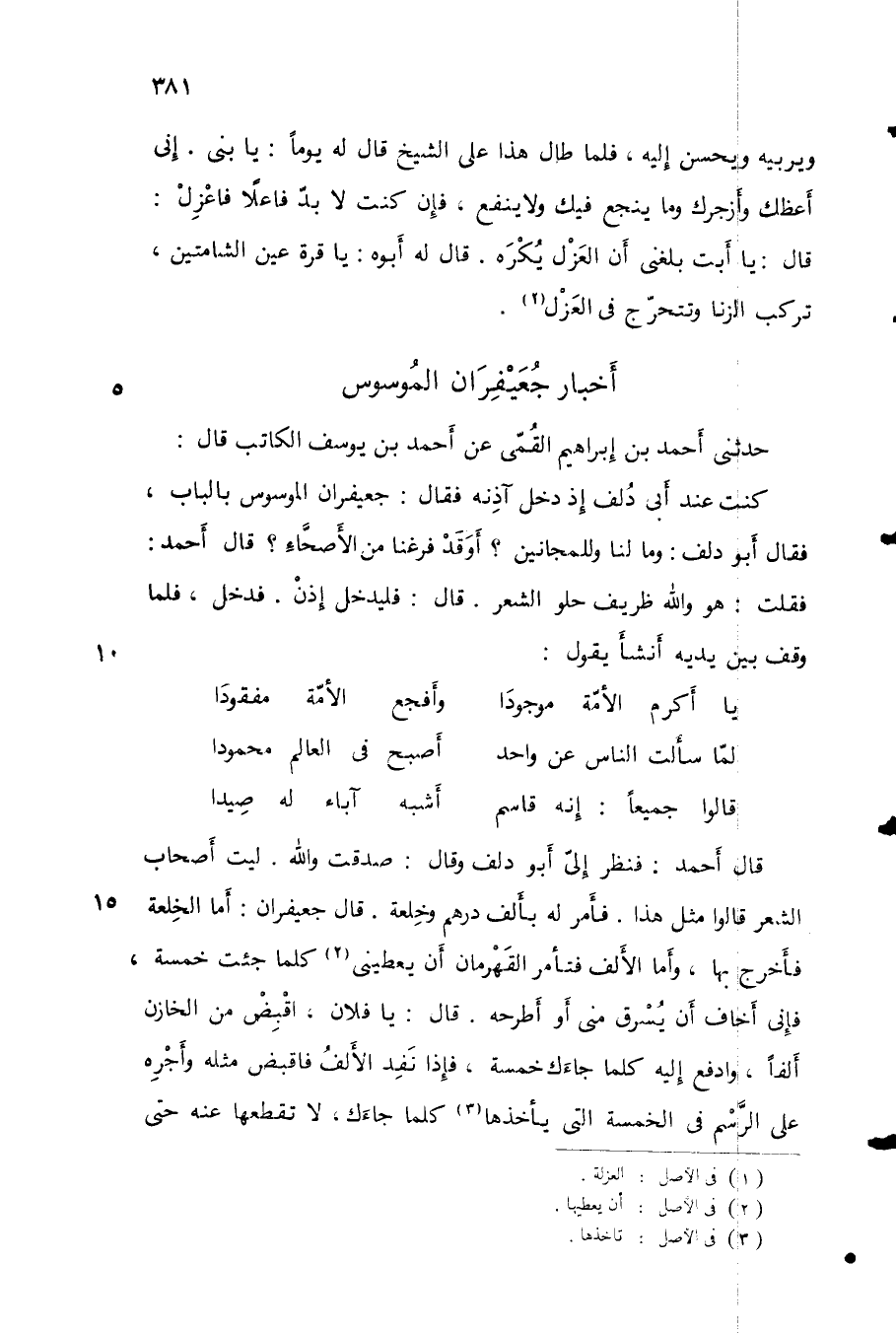 قال أحمد: فنظر إلي أبو دلف وقال: صدقت والله. ليت أصحاب الشعر قالوا مثل هذا. فأمر له بألف دره وخلعة. قال جعيفران: أما الخلقة فأخرج بها، وأما الألف فتأمر القهرمان أن يعطيني كلما جئت خمسة، فإني أخاف أن يُسرق مني أو أطرحه. قال: يا فلان، اقبِض من الخازن ألفاً، وادفع إليه كلما جاءك خمسة، فإذن نَفِد الألفُ فاقبض مثله وأجرِه على الرسم في الخمسة التي يأخذها كلما جاءك، لا تقطعها عنه حتى