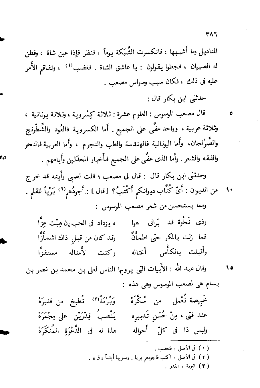 حدثني ابن بكار قال: قال مصعب الموسوس: العلوم عشرة: ثلاثة كِسروية، وثلاثة يونانية، وثلاثة عربية، وواحد عفى على الجميع. أما الكسروية فالعود والشطرنج والصولجان، وأما اليونانية فالهندسة والطب والنجوم، وأما العربية فالنحو والفقه والشعر. وأما الذي عفى على الجميع فأخبار المحدثين وأيامهم.