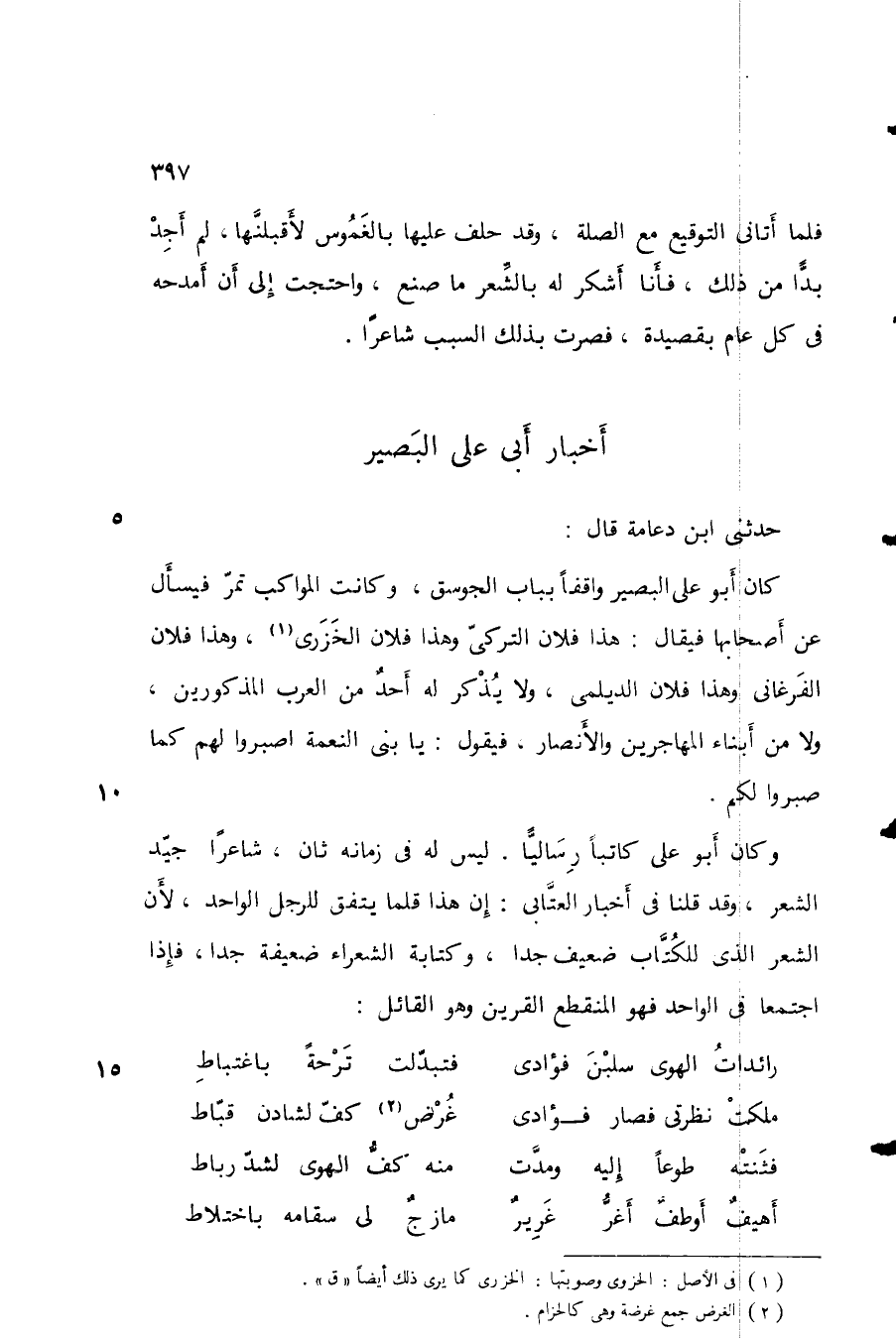 حدثني ابن دعامة قال: كان أبو علي البصير واقفاً بباب الجوسق، وكانت المواكب تمر فيسأل عن أصحابها فيقال: هذا فلان التركي وهذا فلان الخزري، وهذا فلان الفرغاني وهذا فلان الديلمي، ولا يذكر له أحد من العرب المذكورين، ولا من أبناء المهاجرين والأنصار، فيقول: يا بني النعمة اصبروا لهم كما صبروا لكم.