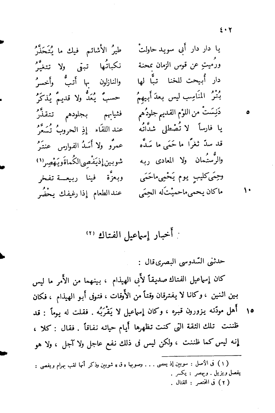 حدثني السدوسي البصري قال: كان إسماعيل الفتاك صديقاً لأبي الهيذام، بينهما من الأمر ما ليس بين اثنين، وكانا لا يفترقان وقتاً من الأوقات، فتوفي أبو الهيذام، فكان أهل مودته يزورون قبره، وكان إسماعيل لا يقربه. فقلت له يوماً: قد ظننت تلك الثقة التي كنت تظهرها أيام حياته نفاقاً. فقال: كلا، إنه ليس كما ظننت، ولكن ليس في ذلك نفع عاجل ولا آجل، ولا هو