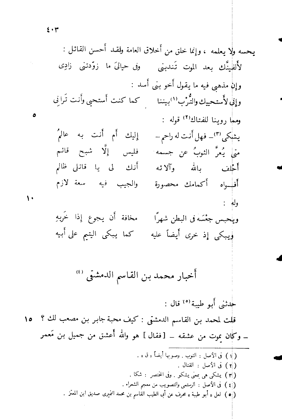 حدثني أبو طيبة قال: قلت لمحمد بن القاسم الدمشقي: كيف محبة جابر بن مصعب لك؟ - وكان يموت من عشقه - فقال هو والله أعشق من جميل بن معمر