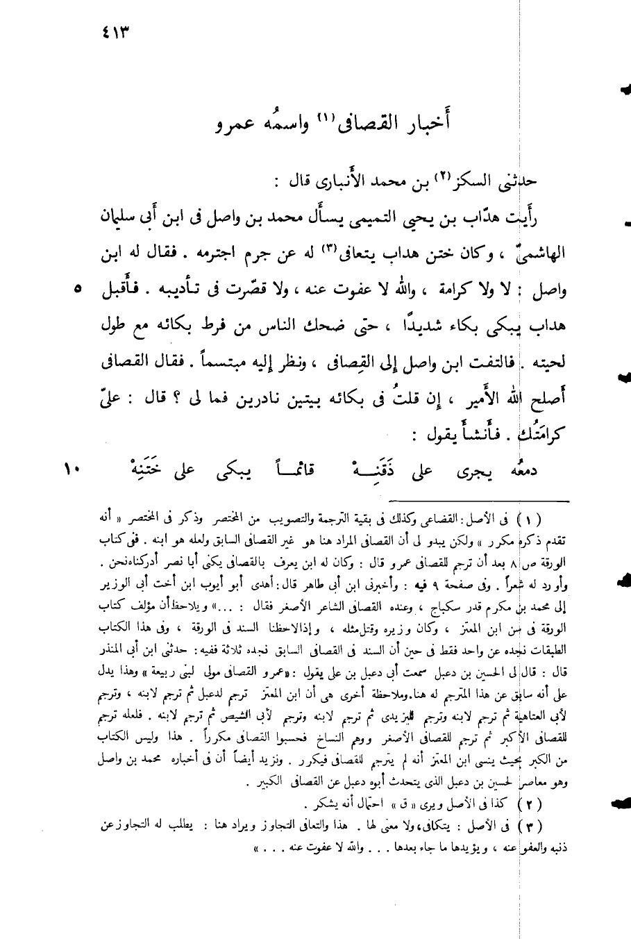 حدثني السكز بن محمد الأنباري قال: رأيت هداب بن يحيى التميمي يسأل محمد بن واصل في ابن أبي سليمان الهاشمي، وكان ختن هداب يتعافى له عن جرم اجترمه. فقال له ابن واصل: لا ولا كرامة، والله لا عفوت عنه، ولا عفوت عنه، ولا قصرت في تأديبه. فأقبل هداب يبكي بكاء شديداً، حتى ضحك الناس من فرط بكائه مع طول لحيته. فالتفت ابن واصل إلى القصافي، ونظر إليه مبتسماً. فقال القصافي أصلح الله الأمير، إن قلت في بكائه بيتين نادرين فما لي؟ قال: علي كرامتك. فأنشأ يقول: