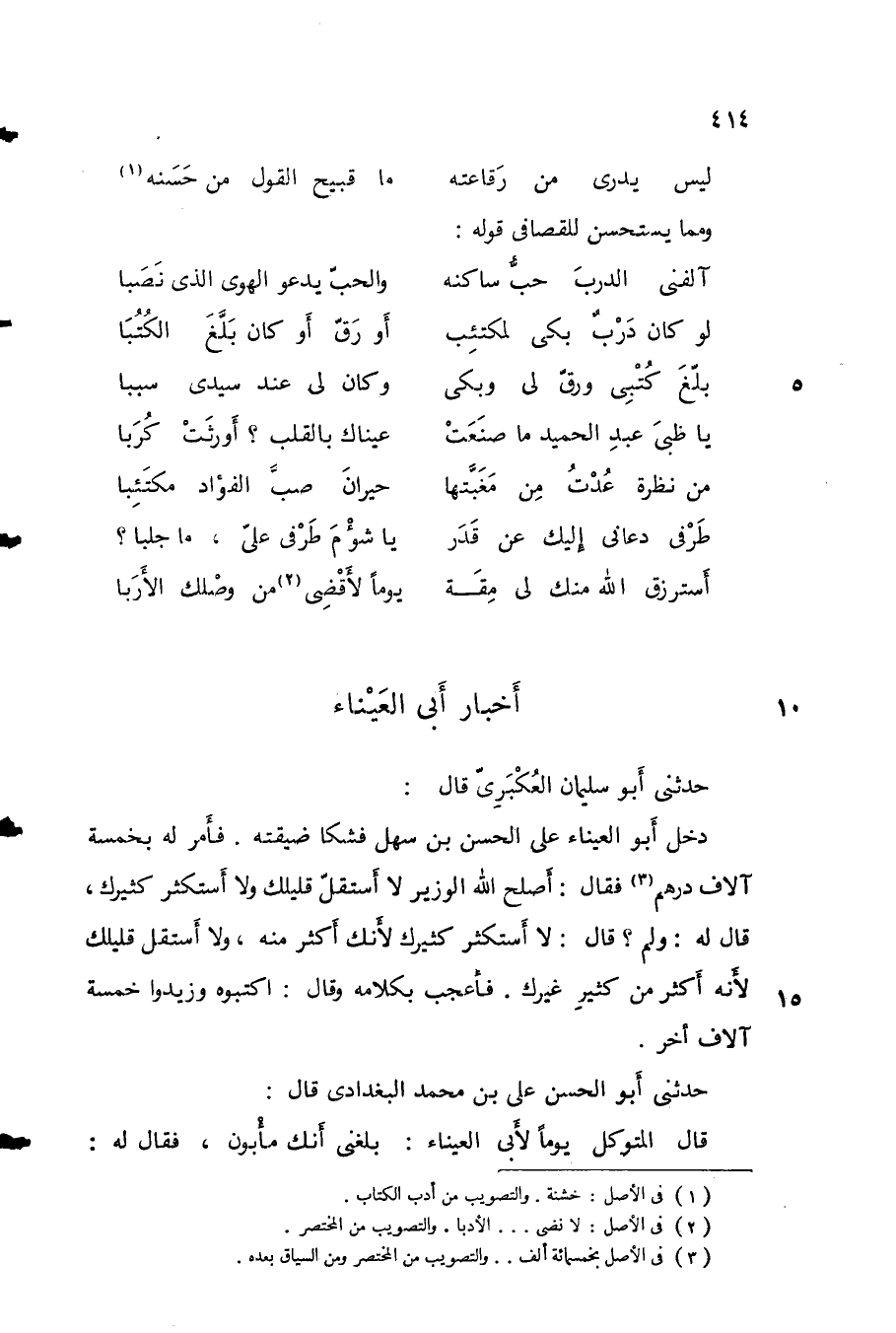 حدثني أبو سليمان العكبري قال: دخل أبو العيناء على الحسن بن سهل فشكا ضيقته. فأمر له بخمسة آلاف درهم فقال: أصلح الله الوزير لا أستقل قليلك ولا أستكثر كثيرك، قال له: ولم؟ قال: لا أستكثر كثيرك لأنك أكثر منه، ولا أستقل قليلك لأنه أكثر من كثير غيرك. فأعجب بكلامه وقال: اكتبوه وزيدوا خمسة آلاف أخر.