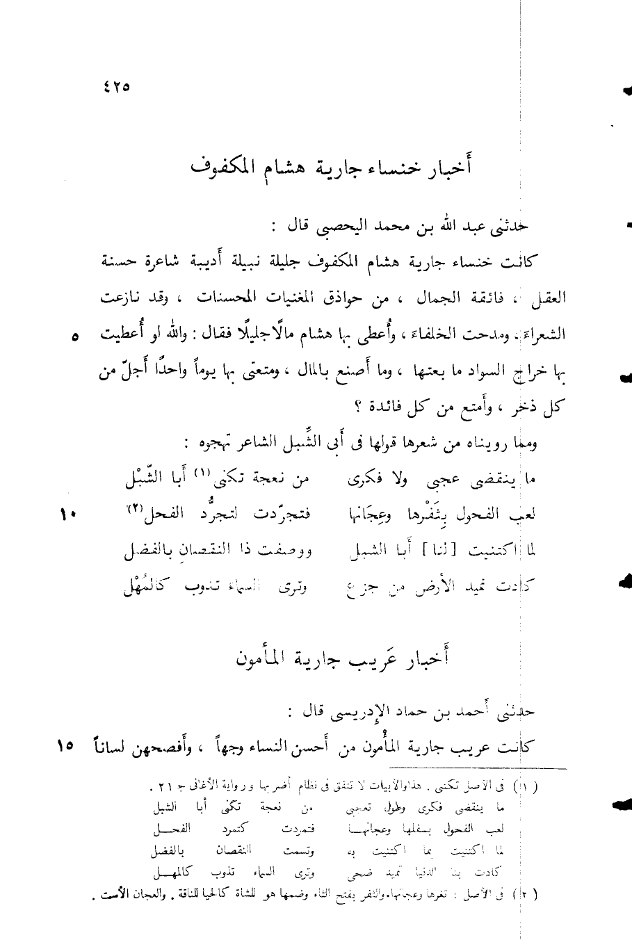 حدثني عبد الله بن محمد اليحصبي قال: كانت خنساء جارية هشام المكفوف جليلة نبيلة أديبة شاعرة حسنة العقل، فائقة الجمال، من حواذق المغنيات المحسنات، وقد نازعت الشعراء، ومدحت الخلفاء، وأعطى بها هشام مالاً جليلاً فقال: والله لو أعطيت بها خراج السواد ما بعتها، وما أصنع بالمال، ومتعتي بها يوماً واحداً من كل ذخر، وأمتع من كل فائدة؟ ومما رويناه من شعرها قولها في أبي الشبل الشاعر تهجوه: