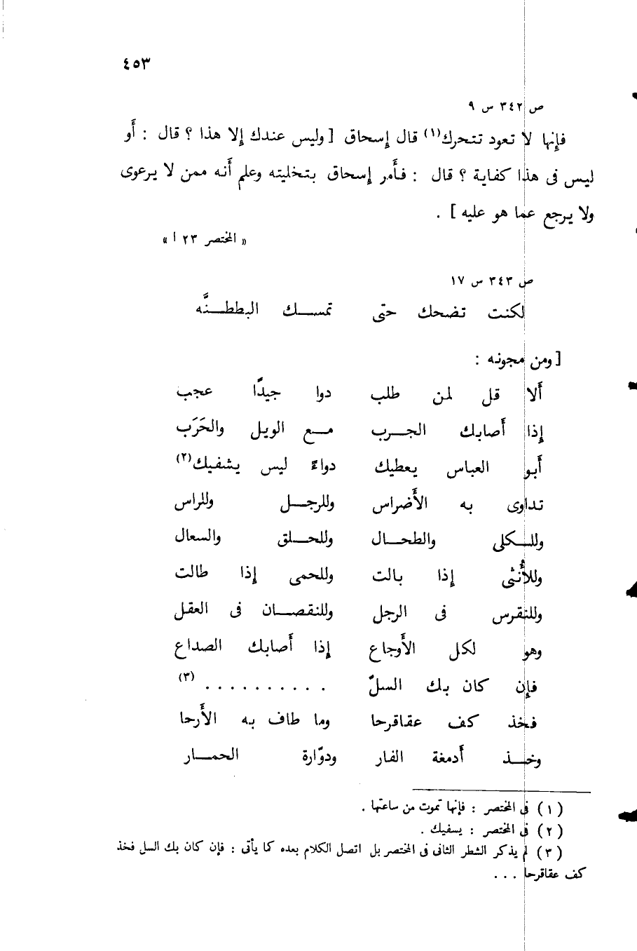 فإنها لا تعود تتحرك قال إسحاق وليس عندك إلا هذا؟ قال: أو ليس في هذا كفاية؟ قال: فأمر إسحاق بتخليته وعلم أنه ممن لا يرعوي ولا يرجع عما هو عليه.