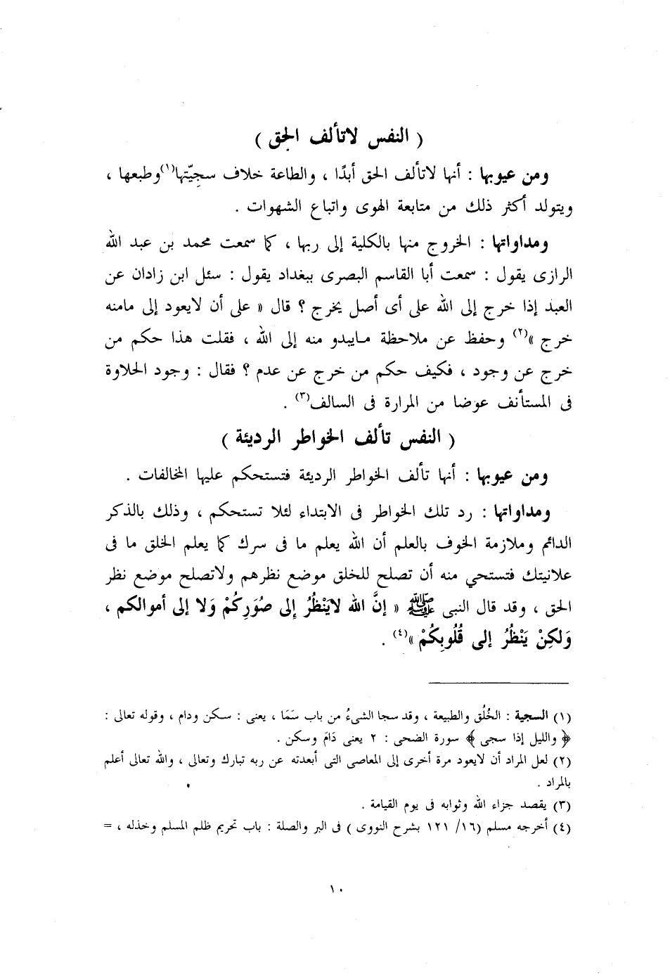 وَمن عيوبها حبها للْكَلَام على النَّاس والخوض فِي ففايق الْعُلُوم ليصبو بِهِ قُلُوب الأغيار وَيصرف بِحسن كَلَامه وُجُوه النَّاس إِلَيْهِ