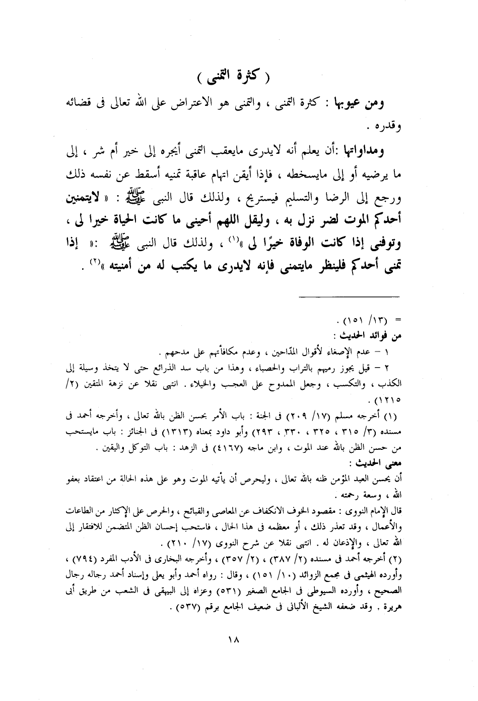 ومداواتها تقريب الْأَجَل وَيعلم أَن بعض السّلف قَالَ أَحسب الله لَا يُؤمن على حَال فَأخذ الْأَحْوَال كلهَا