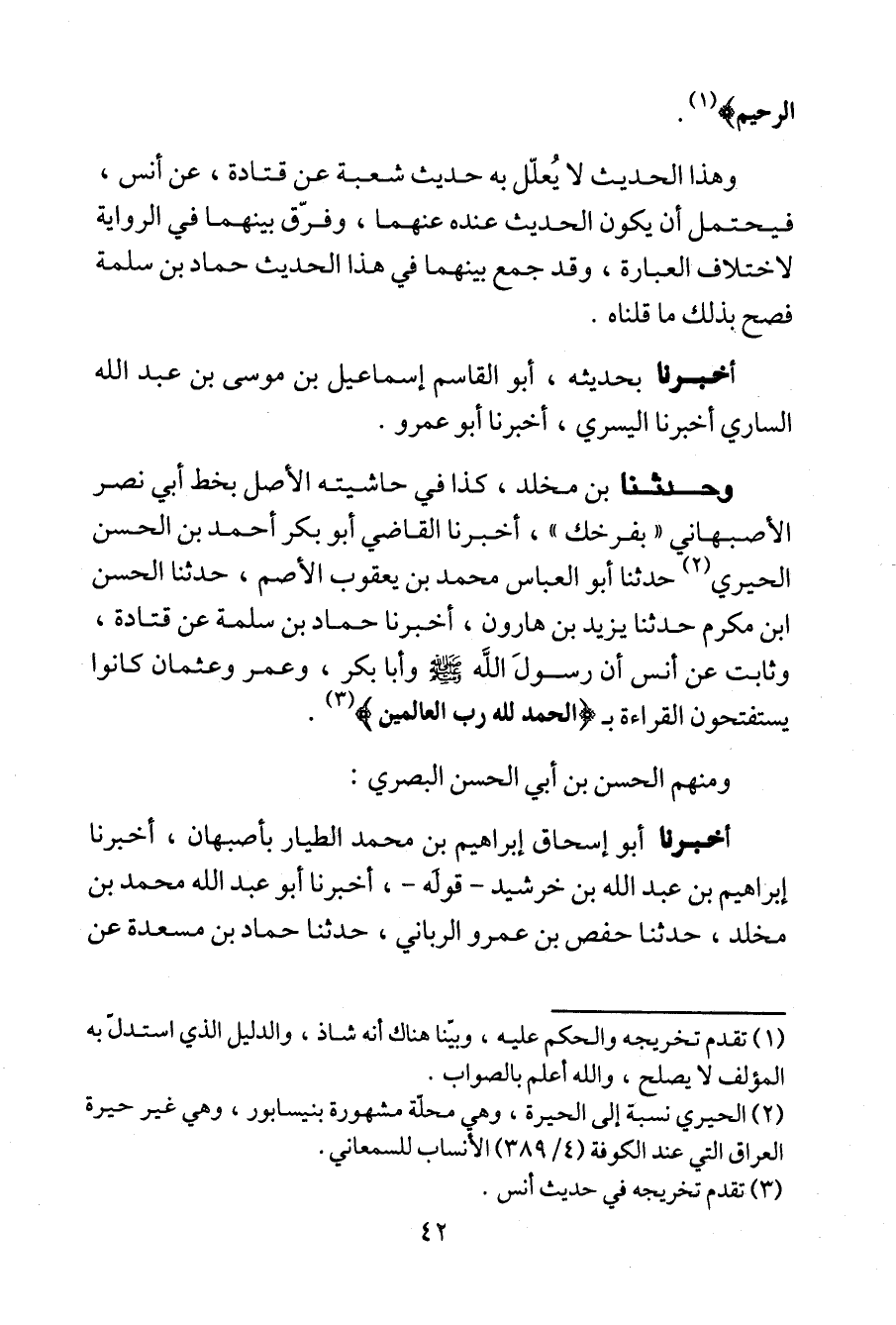 وحدثنا ابن مخلد كذا في حاشية الأصل بخط أبي نصر الأصبهاني "بفرخك" أخبرنا القاضي أبو بكر أحمد بن الحسن الحيري حدثنا أبو العباس محمد بن يعقوب الأصم حدثنا الحسن بن مكرم حدثنا يزيد بن هارون أخبرنا حمَّاد بن سلمة عن قتادة وثابت عن أنس أن رسول الله صلى الله عليه وسلم وأبا بكر وعمر وعثمان كانوا يستفتحون القراءة بـ {الحمد لله رب العالمين} .