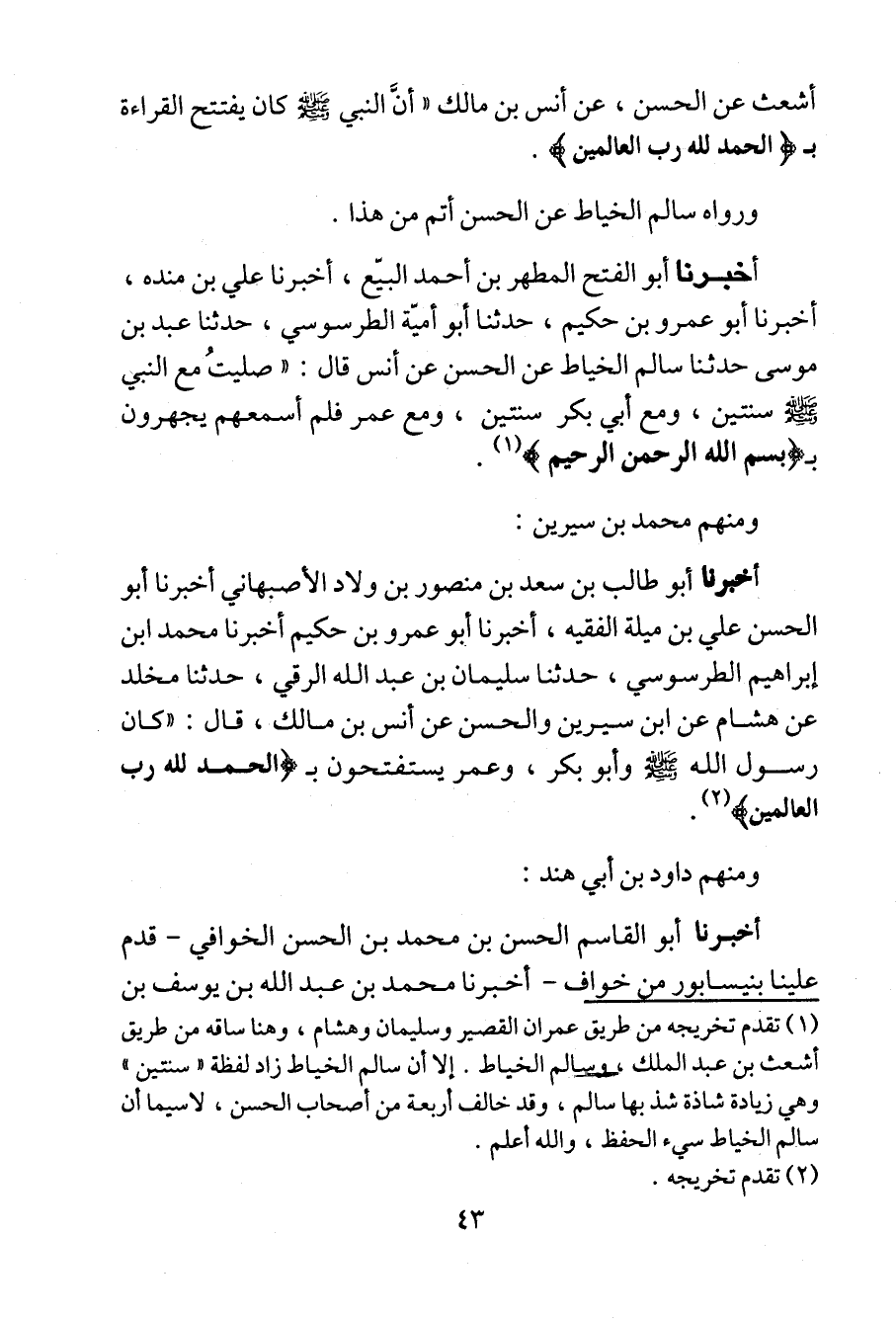 أخبرنا أبو طالب بن سعد بن منصور ولاد الأصبهاني أخبرنا أبو الحسن علي بن ميلة الفقيه أخبرنا أبو عمرو بن حكيم أخبرنا محمد بن إبراهيم الطرسوسي حدثنا سليمان بن عبد الله الرقي حدثنا مخلد عن هشام عن ابن سيرين والحسن عن أنس بن مالك قال كان رسول الله صلى الله عليه وسلم وأبو بكر وعمر يستفتحون بـ {الحمد لله رب العاليمن}