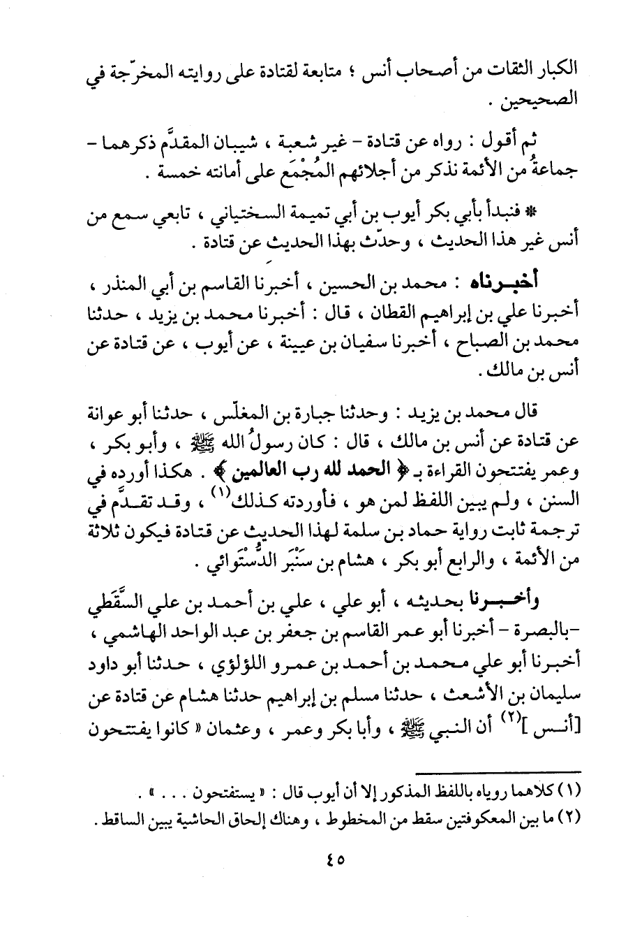 قال محمد بن بن يزيد وحدثنا جبارة بن المغلس حدثنا أبو عوانة عن قَتَادة عن أَنَس بن مالك قال كان رسول الله صلى الله عليه وسلم وأبو بكر وعمر يفتتحون القراءة بـ {الحمد لله رب العالين} . هكذا أورده في السن ولم يبين اللفظ لمن هو فأوردته كذلك وقد تقدم في ترجمة ثابت رواية حمَّاد بن سَلَمة لهذا الحديث عن قَتَادة فيكون ثلاثة من الأئمة والرابع أبو بكر هشام بن سَنْبَر الدستوائي.