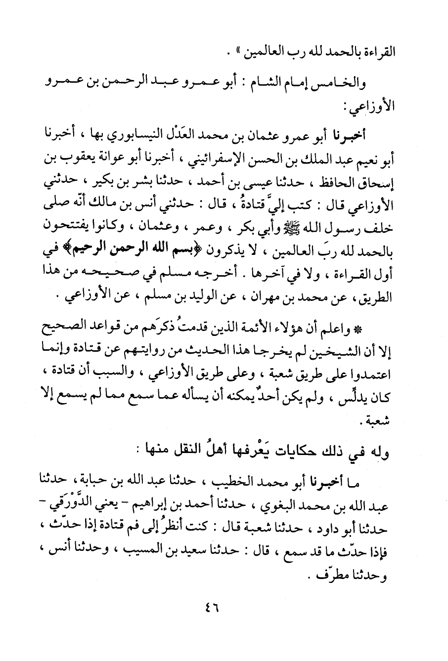 أخبرنا أبو عمرو عثمان بن محمد العدل النيسابوري بها أخبرنا أبو نعيم عبد الملك بن الحسن الإسفراييني أخبرنا أبو عوانة يعقوب بن إسحاق الحافظ حدثنا عيسى بن أحمد حدثنا بشر بن بكير حدثني الأوزاعي قال كتب إلي قتادة قال حدثني أنس بن مالك أنه صلى خلف رسول الله صلى الله عليه وسلم وأبي بكر وعمر وعثمان وكانوا يفتتحون بـ {الحمد لله رب العالمين} لا يذكرون بسم الله الرحمن الرحيم في أول القراءة ولا في آخرها. أخرجه مسلم في صحيحه من هذا الطريق عن محمد بن مهران عن الوليد بن مسلم عن الأوزاعي.
