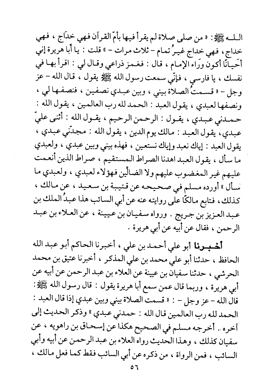 أخبرنا أبو علي أحمد بن علي أخبرنا الحاكم أبو عبد الله الحافظ حدثنا أبو علي محمد بن علي المذكر أخبرنا عتيق بن محمد الحرشي حدثنا سفيان بن عيينة عن العلاء بن عبد الرحمن عن أبيه عن أبي هريرة وربما قال عمن سمع أبا هريرة يقول قال رسول الله صلى الله عليه وسلم قال الله عز وجل: قَسَمْتُ الصَّلاَةَ بَيْنِي وَبَيْنَ عَبْدِي إذا قال الْعَبْدُ: {الْحَمْدُ لِلَّهِ رَبِّ الْعَالَمِينَ} قال اللَّهُ: حَمِدَنِي عَبْدِي وذكر الحديث إلى آخره. أخرجه مسلم في الصحيح هكذا عن إسحاق بن راهويه عن سفيان كذلك وهذا الحديث رواه العلاء بن عبد الرحمن عن أبيه وأبي السائب فمن الرواة من ذكره عن أبي السائب فقط كما فعل مالك،