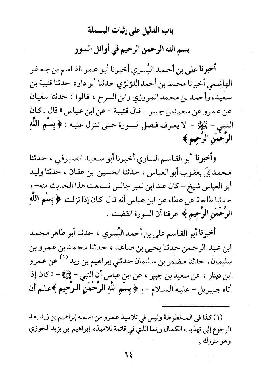 أخبرنا علي بن أحمد البسري أخبرنا أبو عمر القاسم بن جعفر الهاشمي أخبرنا محمد بن أحمد اللؤلؤي حدثنا أبو داود حدثنا قتيبة بن سعيد وأحمد بن محمد المروزي وابن السرح قالوا حدثنا سفيان عن عمرو عن سعيد بن جبير قال قتيبة عن ابن عباس قال كان النبي صلى الله عليه وسلم لا يعرف فصل السورة حتى تنزل عليه بسم الله الرحمن الرحيم