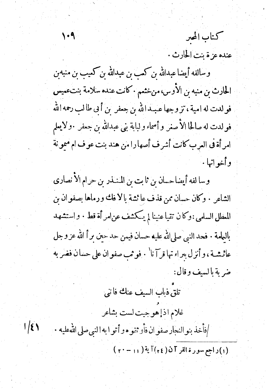 وسالفه أيضاً حسان بن ثابت بن المنذر بن حرام الأنصاري الشاعر. وكان حسان ممن قذف عائشة بالإفك ورماها بصفوان بن المعطل السلمي: وكان تقياً عنيناً لم يكشف عن امرأة قط. واستشهد باليمامة. فحد النبي صلى الله عليه حسان فيمن حد حين برأ الله عز وجل عائشة، وأنزل ببراءتها قرآنا [1] . فوثب صفوان على حسان فضربه ضربة بالسيف وقال: