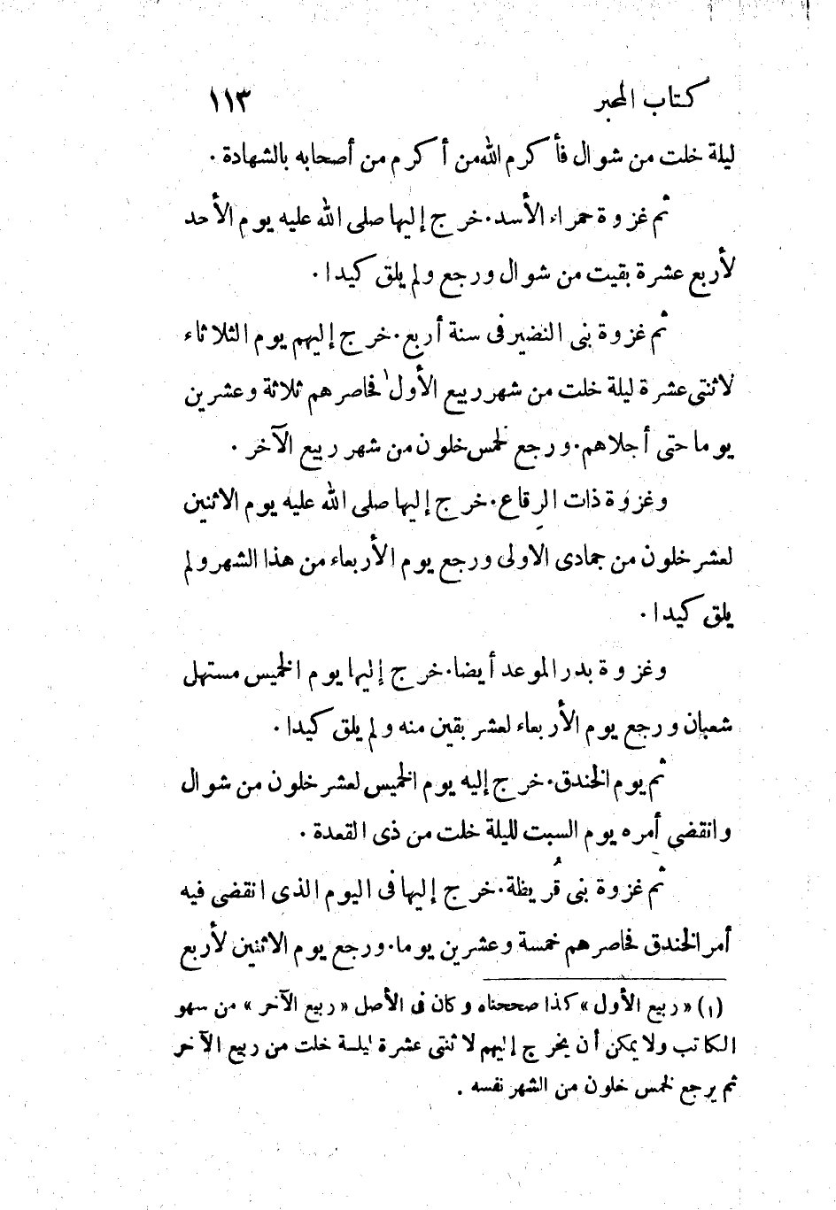 [1] «ربيع الأول» كذا صححناه وكان فى الأصل «ربيع الآخر» من سهو الكاتب ولا يمكن أن يخرج إليهم لاثنتي عشرة ليلة خلت من ربيع الآخر ثم يرجع لخمس خلون من الشهر نفسه.