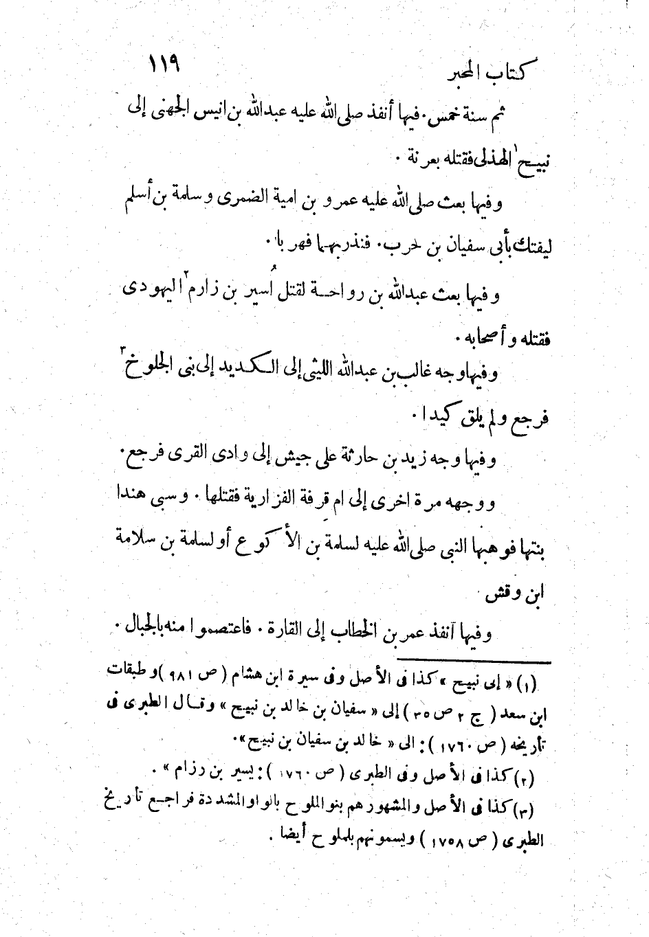 [1] «إلى نبيح» كذا فى الأصل وفى سيرة ابن هشام (ص 981) وطبقات ابن سعد (ج 2 ص 35) إلى «سفيان بن خالد بن نبيح» وقال الطبري فى تأريخه (ص 1760) : الى «خالد بن سفيان بن نبيح» .