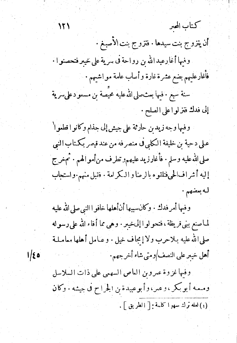 وفيها وجه زيد بن حارثة على جيش إلى جذام وكانوا قطعوا [1] على دحية بن خليفة الكلبي في منصرفه من عند قيصر بكتاب النبي صلى الله عليه وسلم. فأغار زيد عليهم وتطرف من أموالهم. ثم خرج إليه أشراف الحي فتلقوه بالرضا والكرامة. فقبل منهم. واستجاب له بعضهم.