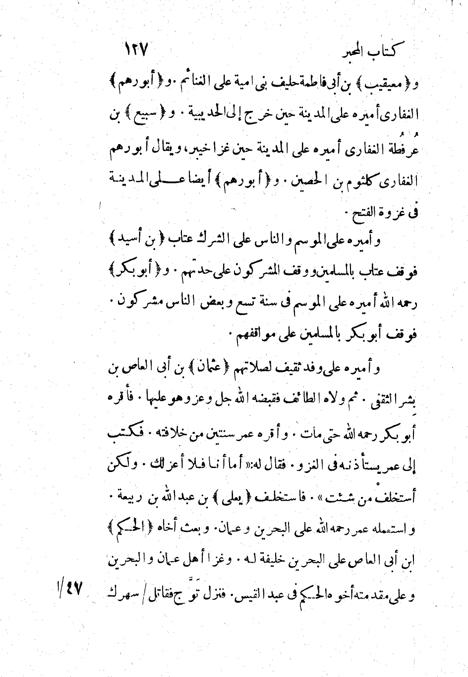 وأميره على وفد ثقيف لصلاتهم (عثمان) بن أبى العاص بن بشر الثقفي. ثم ولاه الطائف فقبضه الله جل وعز وهو عليها. فأقره أَبو بكر رحمه الله حتى مات. وأقره عمر سنتين من خلافته. فكتب إلى عمر يستأذنه فى الغزو. فقال له: «أما أنا فلا أعز لك. ولكن أستخلف من شئت» . فاستخلف (يعلى) بن عبد الله بن ربيعة.