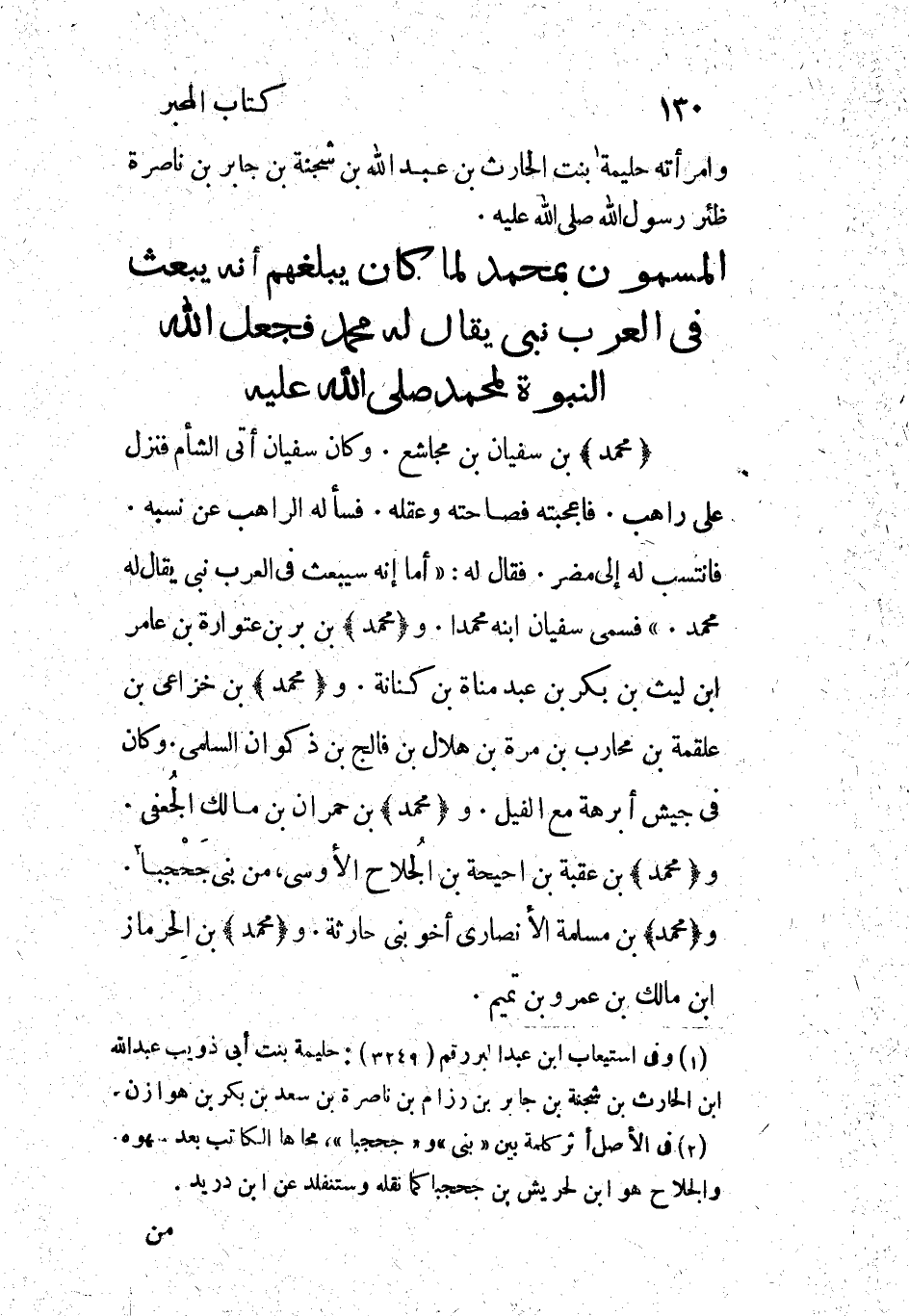 فانتسب له إلى مضر. فقال له: «أما إنه سيبعث في العرب نبي يقال له محمد.» فسمى سفيان ابنه محمدا. و (محمد) بن بر بن عتوارة بن عامر ابن ليث بن بكر بن عبد مناة بن كنانة. و (محمد) بن خزاعي بن علقمة بن محارب بن مرة بن هلال بن فالج بن ذكوان السلمي. وكان في جيش أبرهة مع الفيل. و (محمد) بن حمران بن مالك الجعفي.