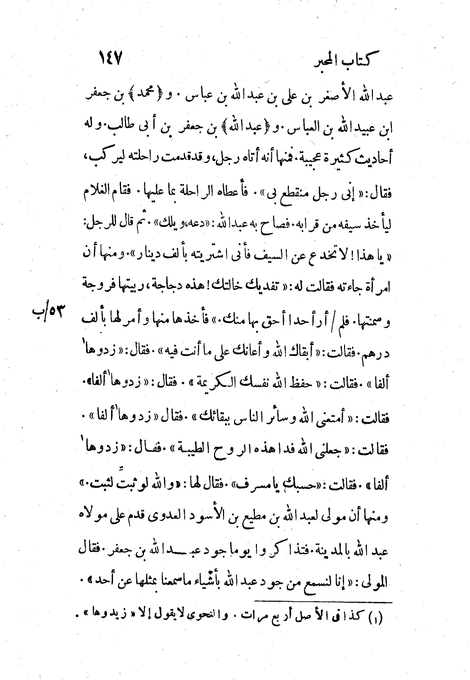 عبد الله الأصغر بن علي بن عبد الله بن عباس. و (محمد) بن جعفر ابن عبيد الله بن العباس. و (عبد الله) بن جعفر بن أبي طالب. وله أحاديث كثيرة عجيبة. فمنها أنه أتاه رجل، وقد قدمت راحلته ليركَب، فقال: «إني رجل منقطع بي» . فأعطاه الراحلة بما عليها. فقام الغلام ليأخذ سيفه من قرابه. فصاح به عبد الله: «دعه، ويلك» . ثم قال للرجل: