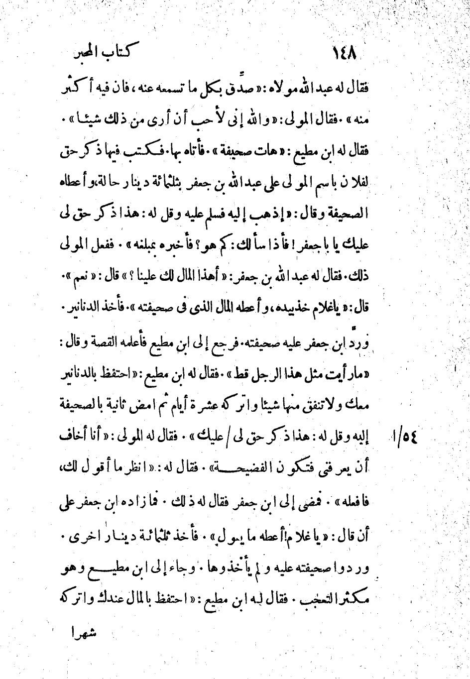 فقال له ابن مطيع: «هات صحيفة» . فأتاه بها. فكتب فيها ذكر حق لفلان باسم المولى على عبد الله بن جعفر بثلاثمائة دينار حالة، وأعطاه الصحيفة وقال: «إذهب إليه فسلم عليه وقل له: هذا ذكر حق لى عليك يا با جعفر! فإذا سألك: كم هو؟ فأخبره بمبلغه» . ففعل المولى ذلك. فقال له عبد الله بن جعفر: «أهذا المال لك علينا؟» قال: «نعم» .