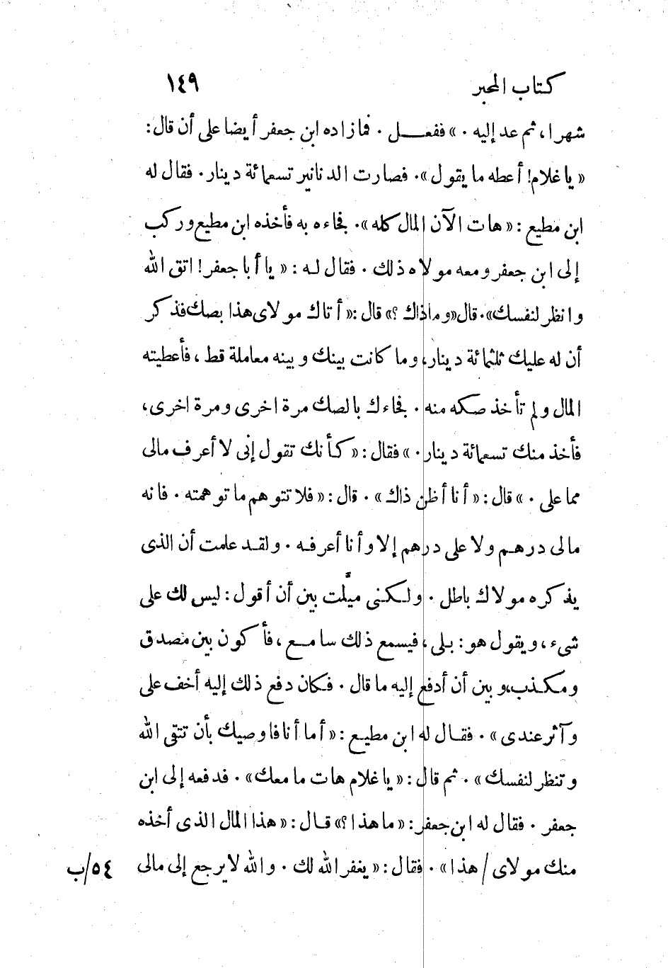 «يا غلام! أعطه ما يقول» . فصارت الدنانير تسعمائة دينار. فقال له ابن مطيع: «هات الان المال كله» . فجاءه به فأخذه ابن مطيع وركب إلى ابن جعفر ومعه مولاه ذلك. فقال له: «يا أبا جعفر! اتق الله وانظر لنفسك» . قال «وما ذاك؟» قال: «أتاك مولاي هذا بصك فذكر أن له عليك ثلاثمائة دينار، وما كانت بينك وبينه معاملة قط، فأعطيته المال ولم تأخذ صكه منه. فجاءك بالصك مرة اخرى ومرة اخرى، فأخذ منك تسعمائة دينار.» فقال: «كأنك تقول إني لا أعرف مالي مما علي.» قال: «أنا أظن ذاك» . قال: «فلا تتوهم ما توهمته. فانه ما لي درهم ولا علي درهم إلا وأنا أعرفه. ولقد علمت أن الذي يذكره مولاك باطل. ولكني ميلت بين أن أقول: ليس لك علي شيء، ويقول هو: بلى، فيسمع ذلك سامع، فأكون بين مصدق ومكذب، وبين أن أدفع إليه ما قال. فكان دفع ذلك إليه أخف على وآثر عندي» . فقال له ابن مطيع: «أما أنا فاوصيك بأن تتقي الله وتنظر لنفسك» . ثم قال: «يا غلام هات ما معك» . فدفعه إلى ابن جعفر. فقال له ابن جعفر: «ما هذا؟» قال: «هذا المال الذي أخذه منك مولاي/ هذا» . فقال: «يغفر الله لك. والله لا يرجع إلى مالي